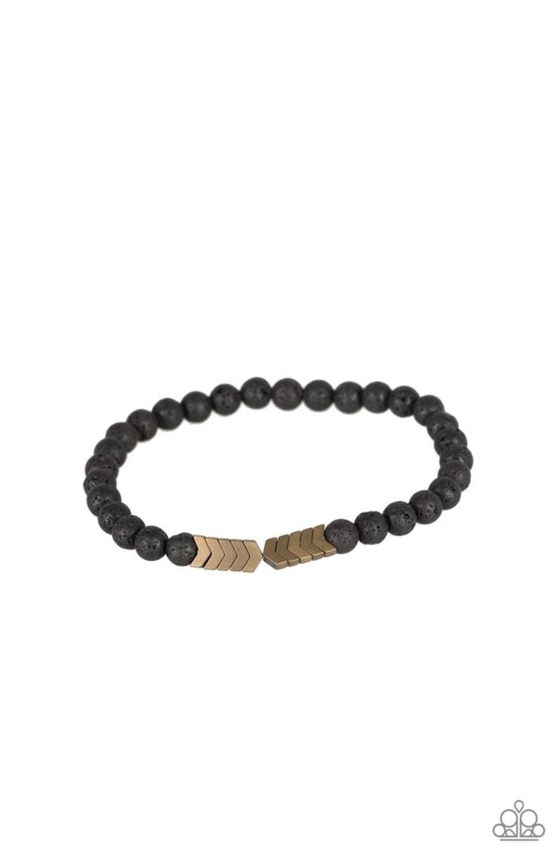 Dainty black lava rock and brass chevron-like frames are threaded along a stretchy band around the wrist for a seasonal look.