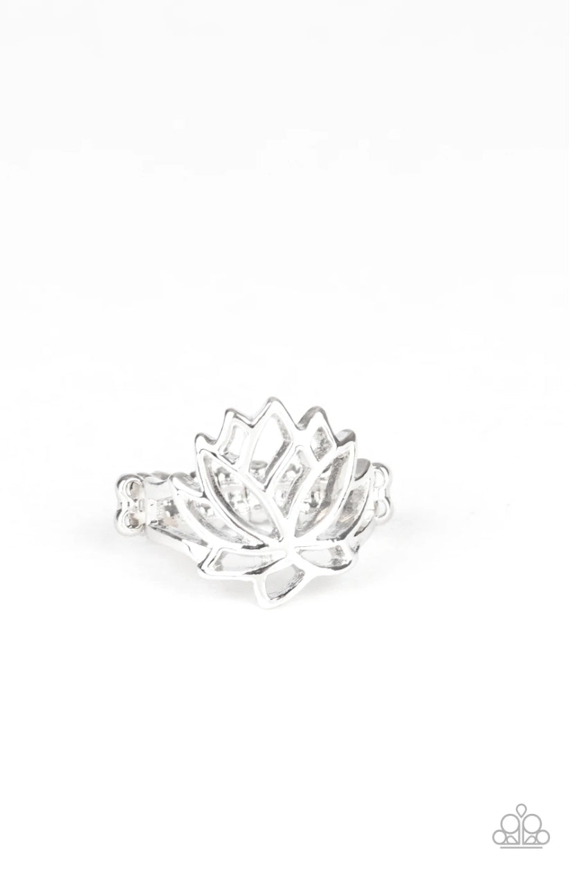Dainty silver bars delicately climb the finger, blooming into a whimsical lotus centerpiece. Features a dainty stretchy band for a flexible fit.