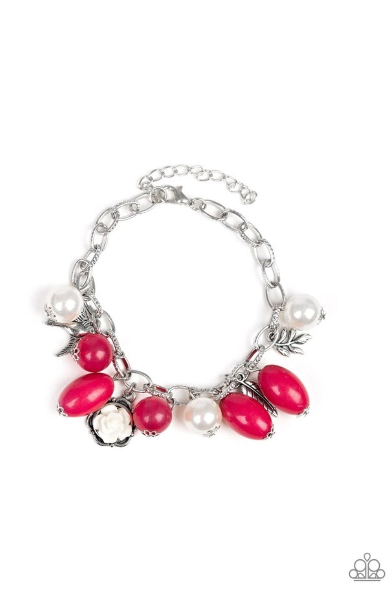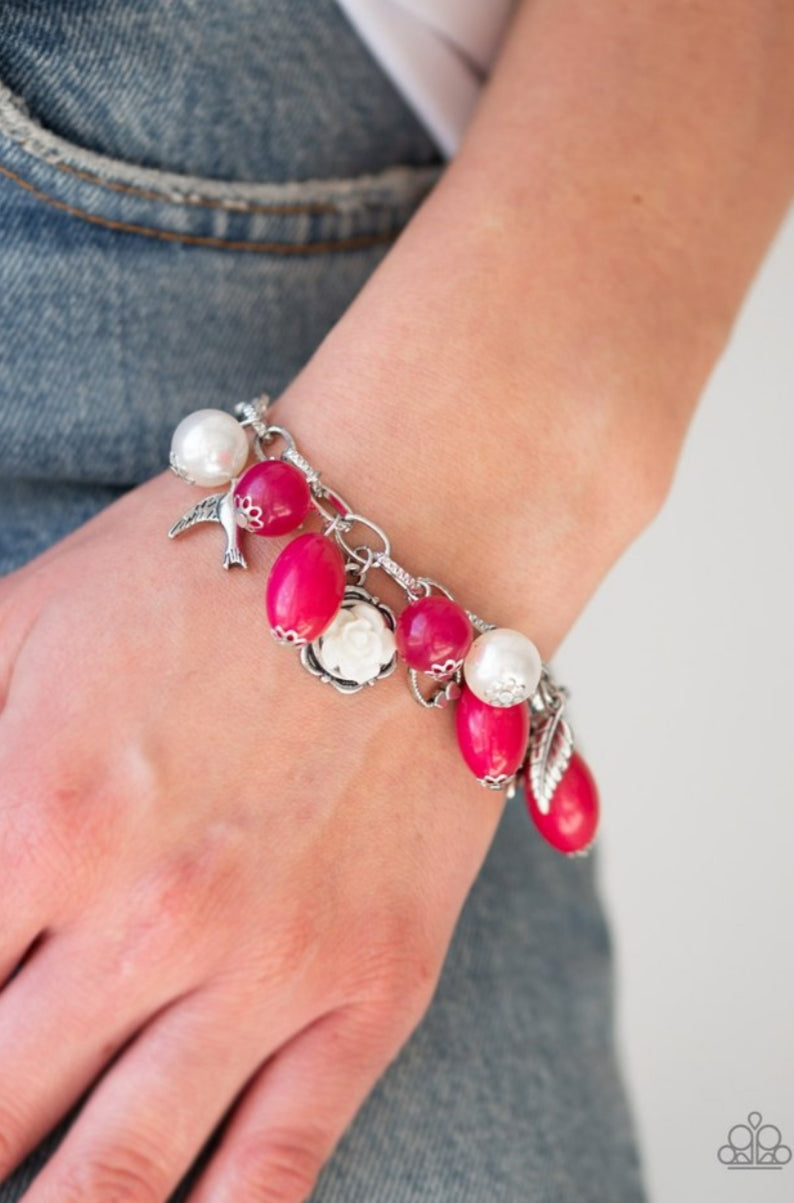 Gorgeous pearls, shiny pink beading, and a collection of shiny silver charms, including a bird and a feather, dance around the wrist in a whimsical fashion. Features an adjustable clasp closure.