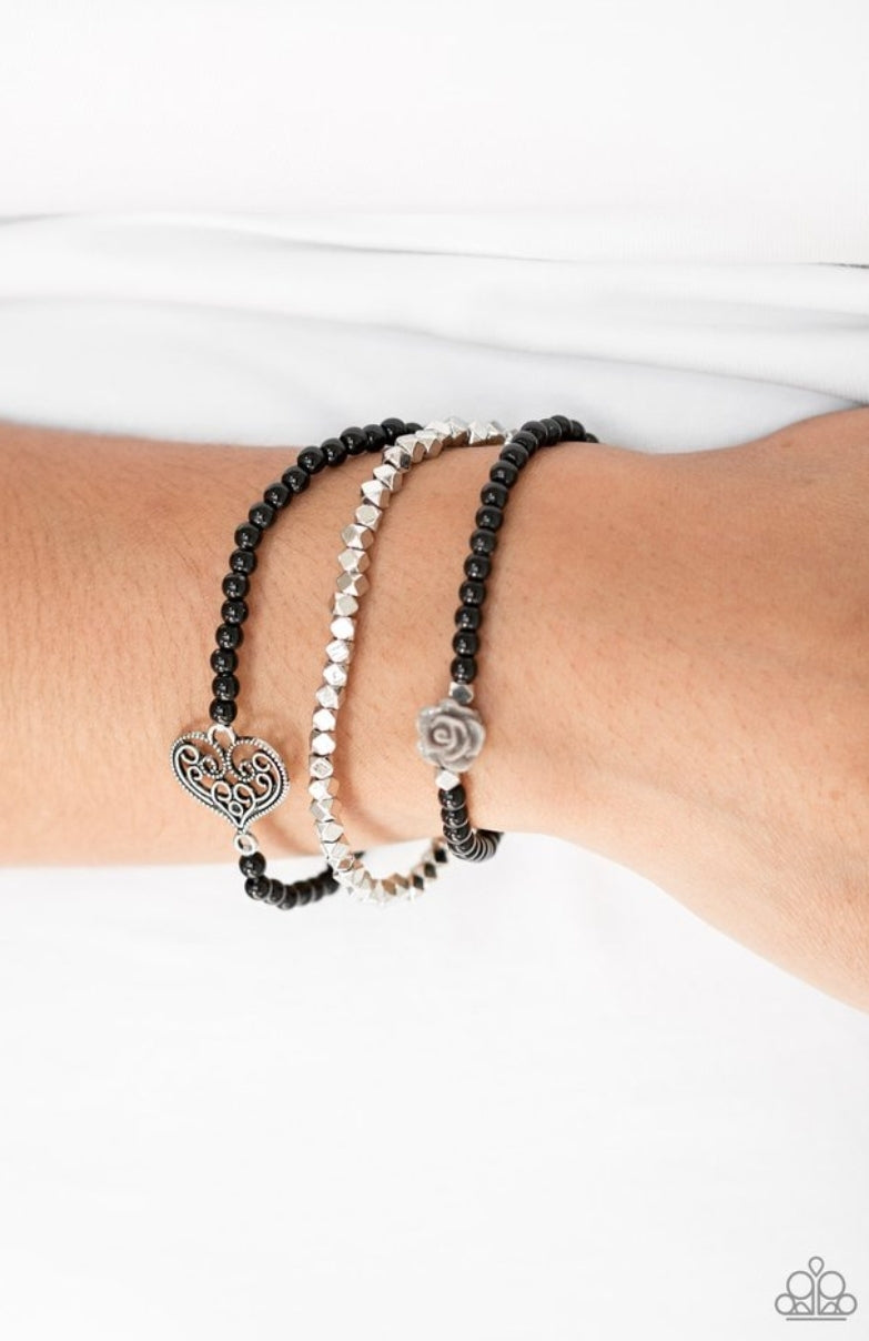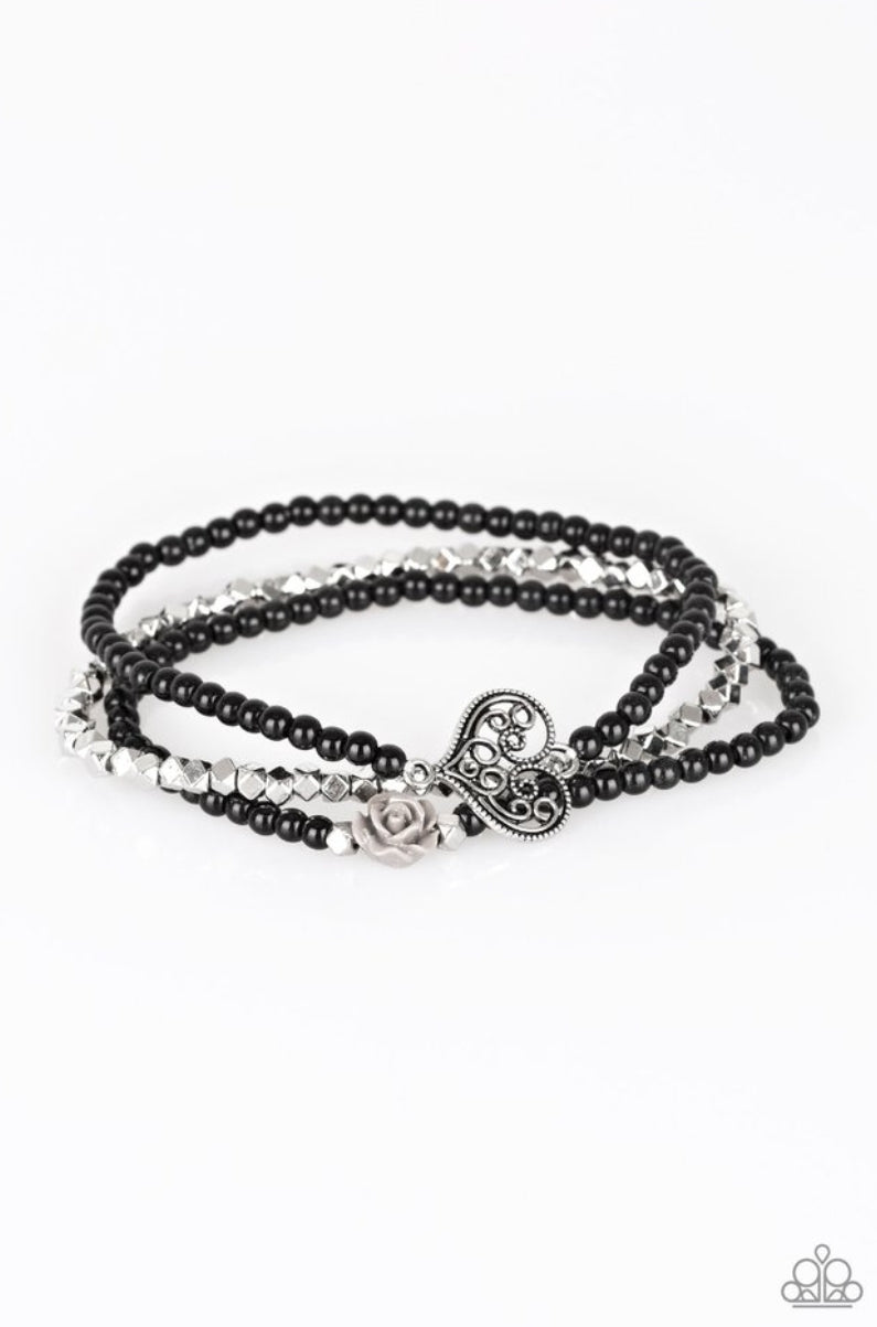 Featuring a gray resin rose and a shimmery silver heart charm, dainty black beads and faceted silver beads are threaded along stretchy bands for a vintage inspired look.