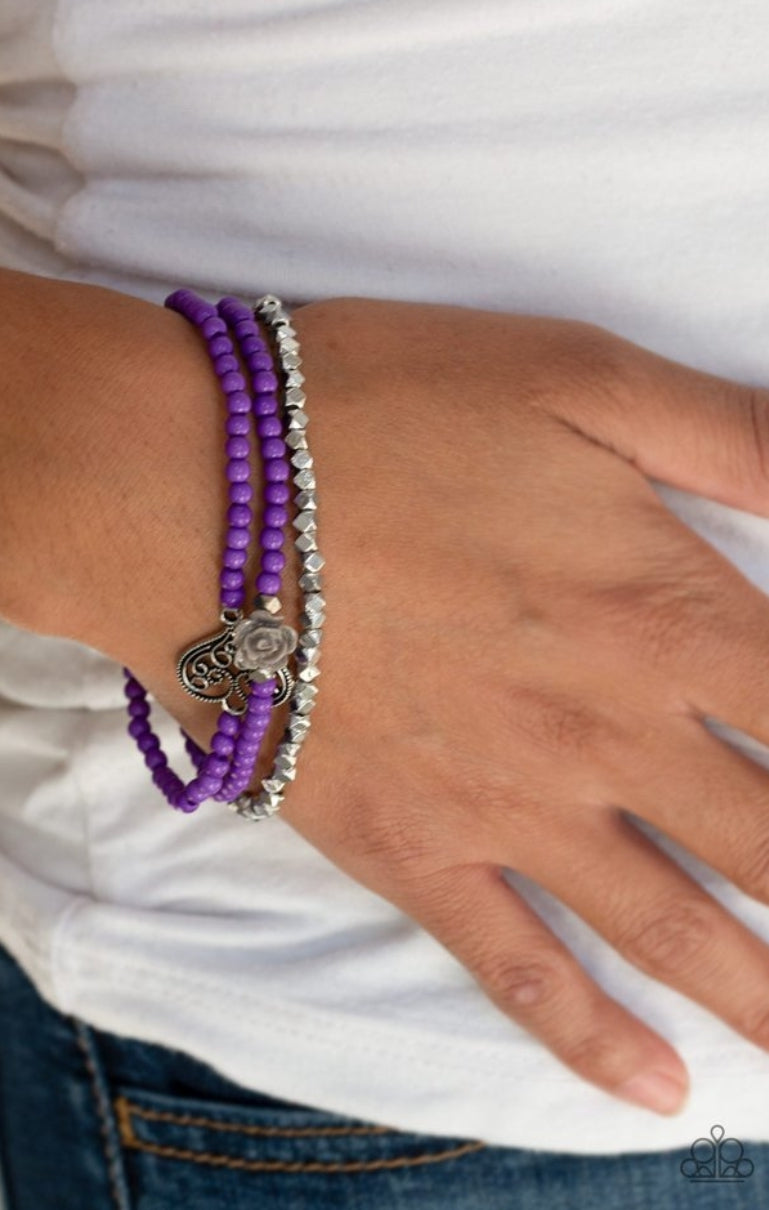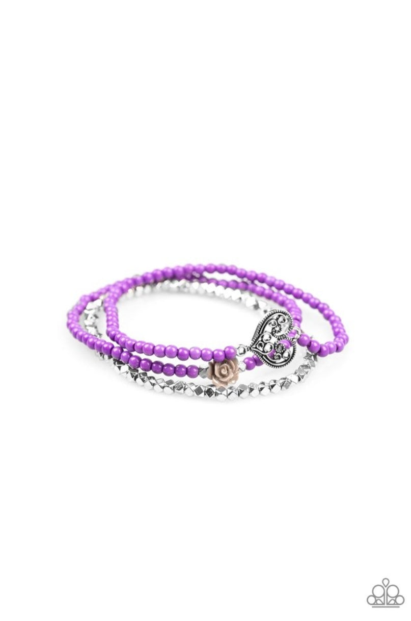 Featuring a gray resin rose and a shimmery silver heart charm, dainty purple beads and faceted silver beads are threaded along stretchy bands for a vintage inspired look.