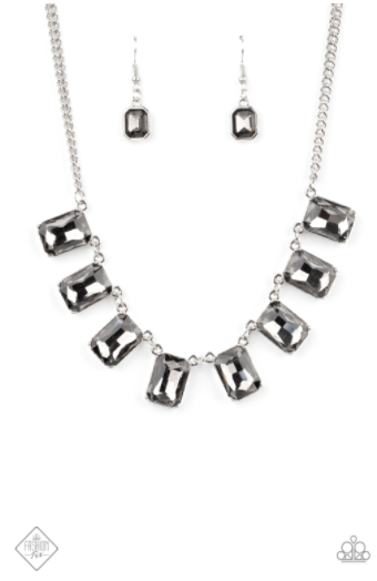 NECKLACE: After Party Access - Silver Encased in sleek silver fittings, a regal chain of oversized smoky emerald-cut gems fans out below the collar in a dramatic finish. Features an adjustable clasp closure. Item #P2RE-SVXX-340UH