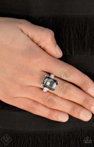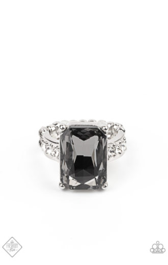 RING: Bring Down the POWERHOUSE - Silver Featuring an elegant emerald-style cut, an oversized smoky gem is pressed into the center of a dainty silver band dotted in glassy white rhinestones, resulting in some serious show-stopping sparkle. Features a dainty stretchy band for a flexible fit. Item #P4RE-SVXX-162UH