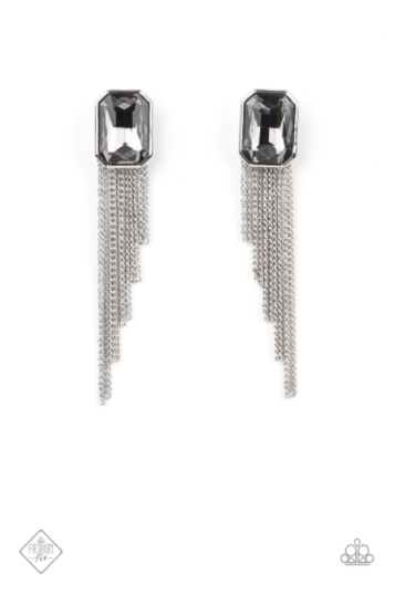 EARRINGS: Save for a REIGNy Day - Silver Tapered silver chains stream from the bottom of an oversized smoky emerald cut gem, creating a regal fringe. Earring attaches to a standard post fitting Item #P5PO-SVXX-188UH