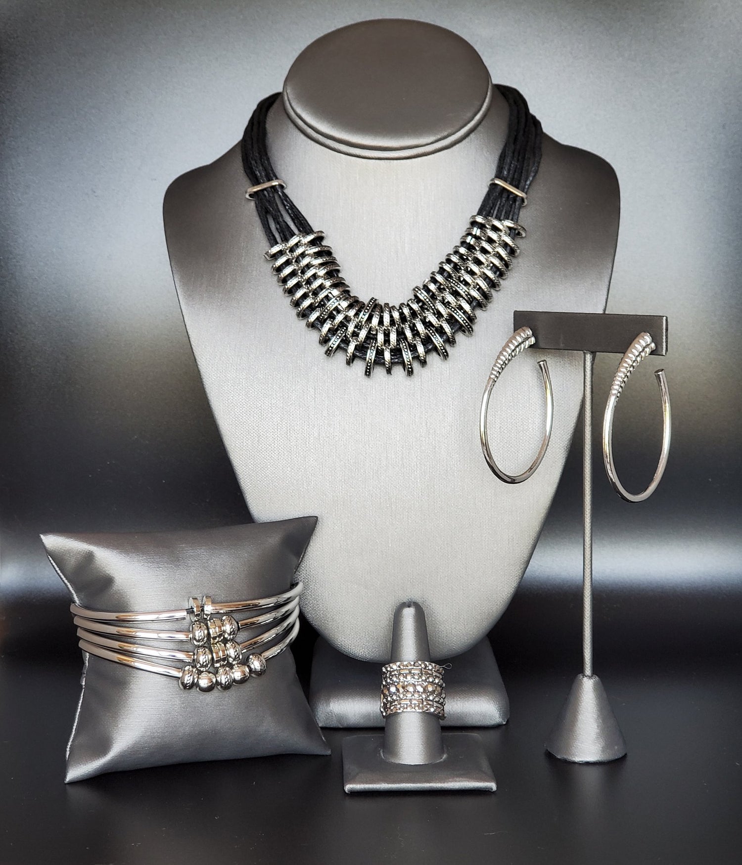 Necklace: "Lock, Stock, and SPARKLE" (P2IN-BKXX-209AA)- old and unapologetic, this hefty necklace gives off a hand-made feel with its multiple strands of black cording held together by industrial silver fittings that shift and slide. Features an adjustable clasp closure.