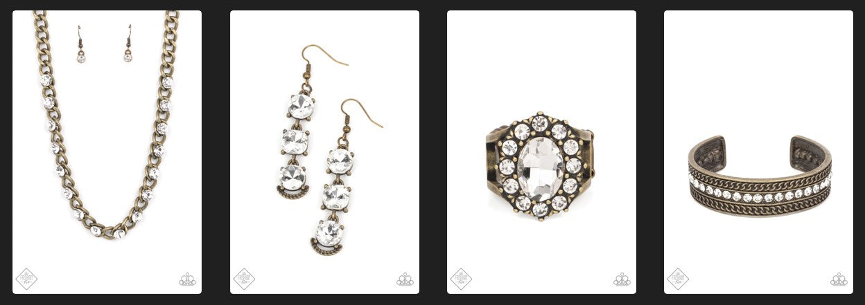 Necklace: "Major Moxie" (P2RE-BRXX-212IJ) -- Sparkling white rhinestones are nestled inside the gritty links of an oversized antiqued brass chain resulting in a dauntless display below the collar. Features an adjustable clasp closure. Sold as one individual necklace. Includes one pair of matching earrings.