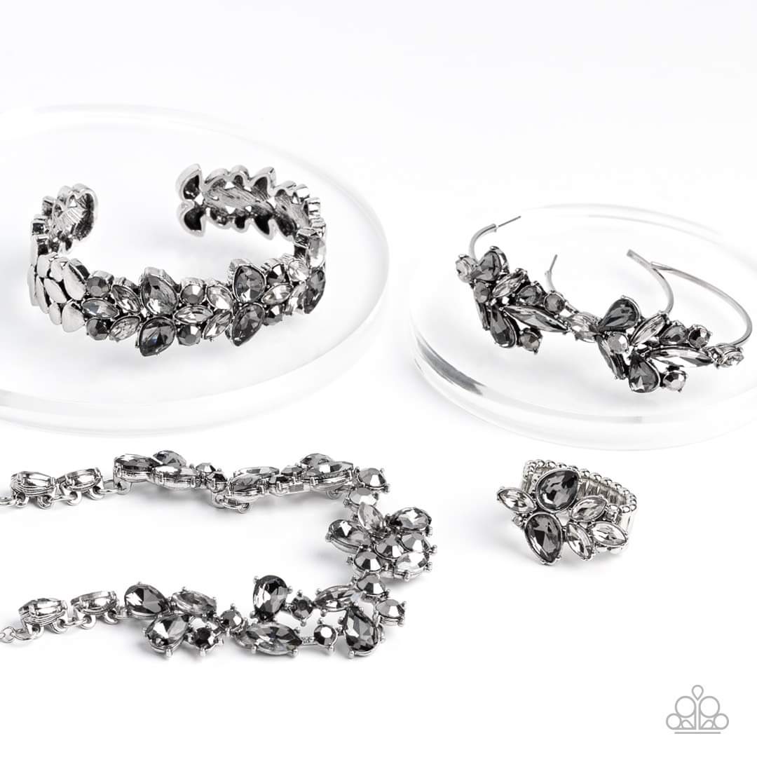 Bracelet: "Glacial Gleam - Silver" (P9ED-SVXX-138IZ) --- Smoky teardrop and sparkling marquise gems converge into an edgy design with a subtle floral motif across the front of a silver cuff. Hematite accents add an air of mystery to the piece, while smooth flattened silver discs border the gleaming gems in a high sheen finish. Sold as one individual bracelet.
