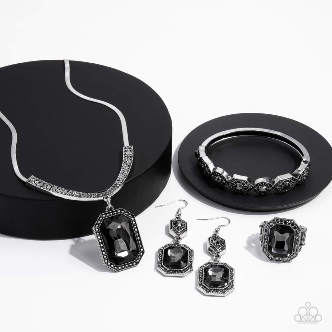 Necklace: "Fit for a DRAMA QUEEN - Silver" (P2RE-SVXX-462JE) -- An oversized, smoky, emerald-cut gem is bordered by tiny hematite rhinestones and dizzying studded texture, creating a smoldering pendant that swings from the bottom of a curved bar. Hematite rhinestones lay side-by-side along the curved bar of silver, graduating in size as they climb the neckline and connect to a flat silver snake chain in a sleek finish. Features an adjustable clasp closure. Sold as one individual necklace. Includes one pair of matching earrings.