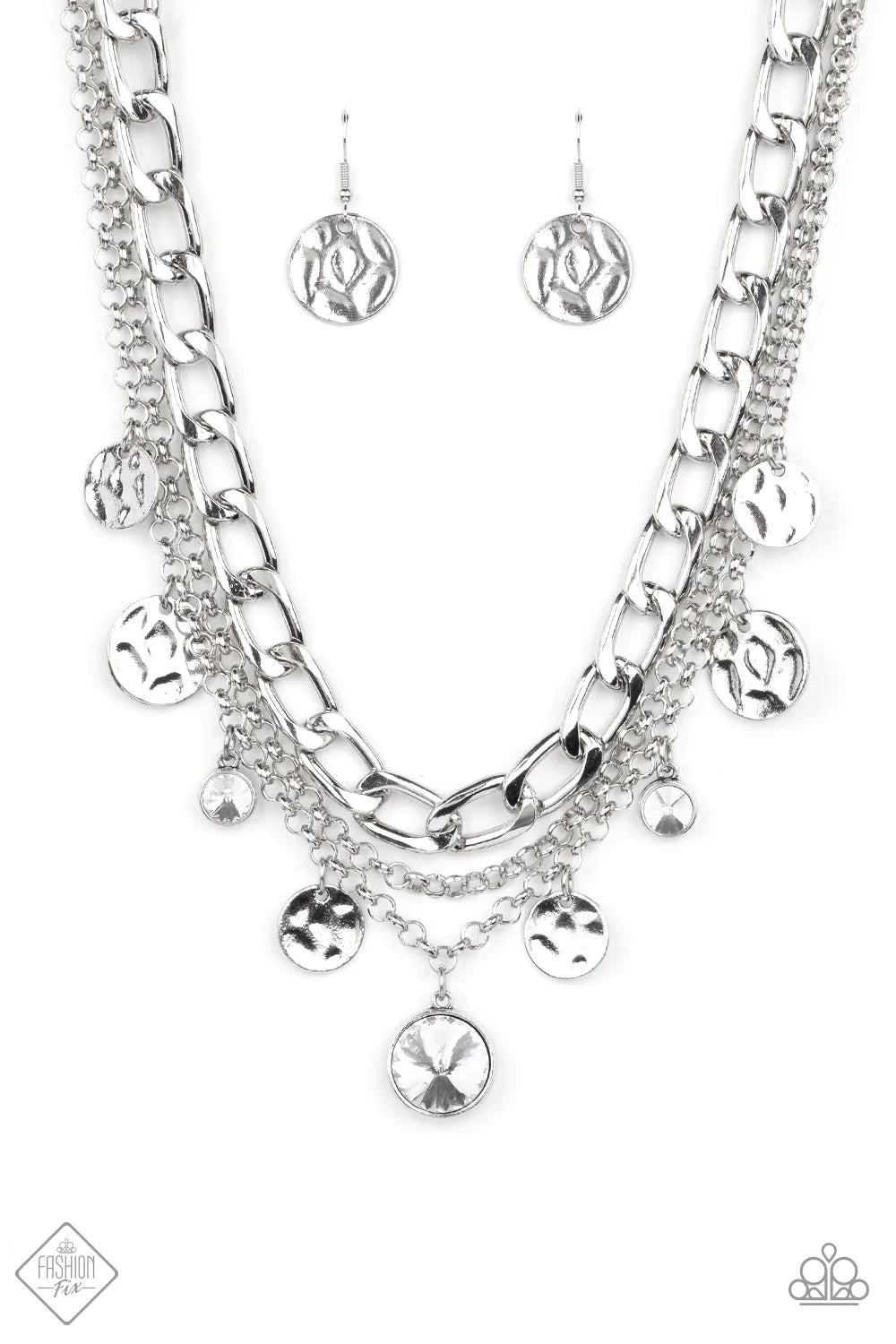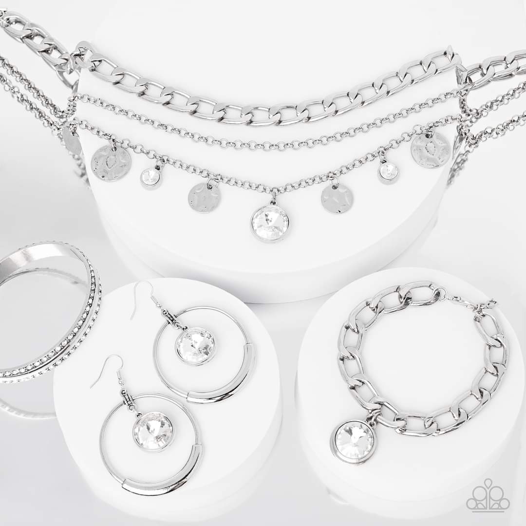 NECKLACE: Industrial Noise - White (P2ST-WTXX-127JW) A thick strand of silver curb chain drapes across the chest between two silver bars, forming the first of three layers. A classic silver chain falls below, offering a simple reprieve before the eye settles on the final strand of silver chain below. Hammered silver discs and brilliant white gems encased in gritty silver fittings dance along the bottommost chain, adding a hint of glitzy whimsicality to the industrial design. Features an adjustable clasp closure.