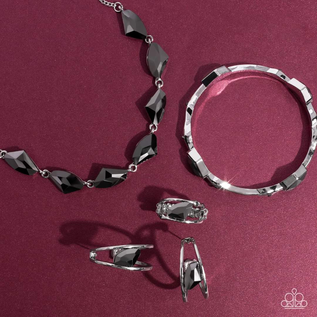 Necklace: Raw Rapture - Silver - P2RE-SVXX-463JN -- A jagged collection of hematite rhinestones falls along the neckline in a fierce display. The asymmetrical cuts of each rhinestone are emphasized by their dramatic faceted surfaces, bouncing light in every direction and emitting a sleek metallic sheen. Features an adjustable clasp closure.