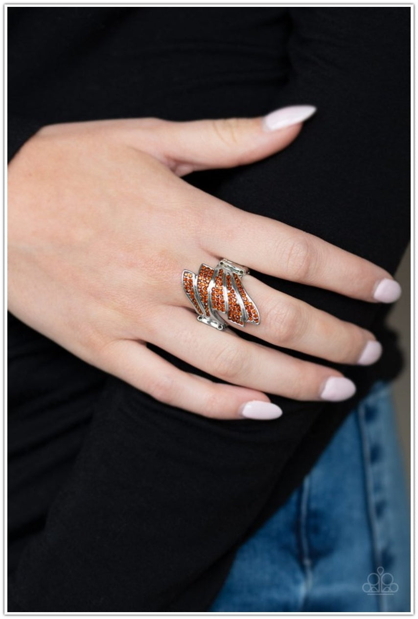 Encrusted in topaz rhinestones, row after row of sparkling silver bands fan across the finger, coalescing into a majestic frame. Features a stretchy band for a flexible fit.