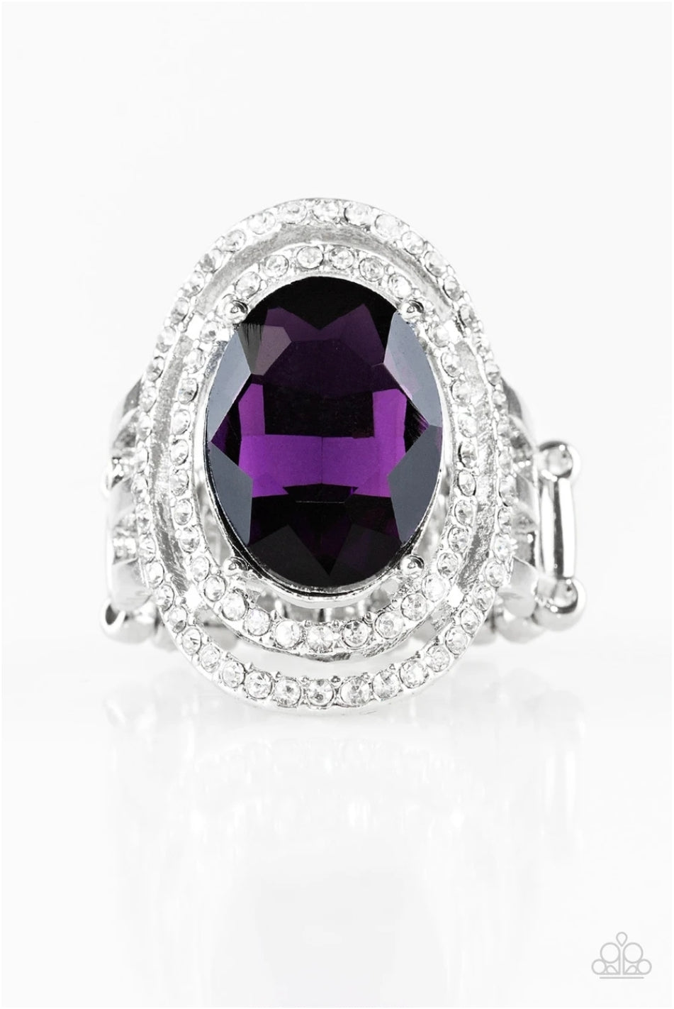 A glittery purple gem sits atop stacked silver frames radiating with glassy white rhinestones for a timeless look. Features a stretchy band for a flexible fit.