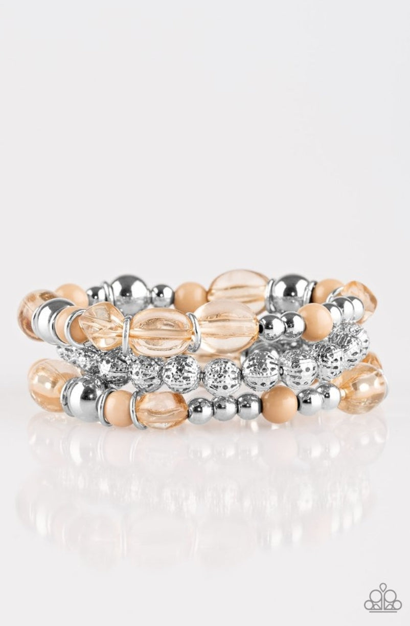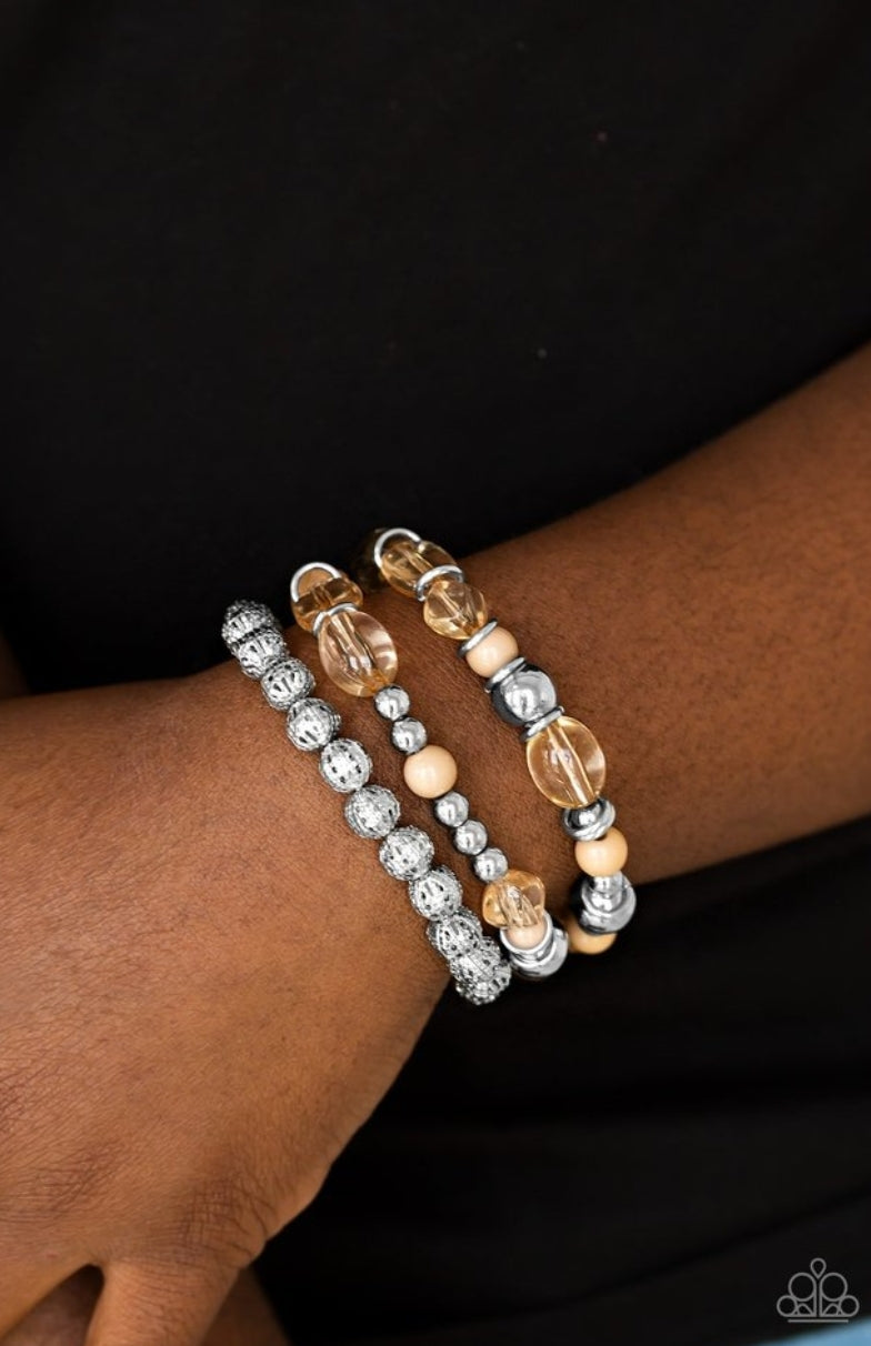 An array of glassy and polished brown beading and mismatched silver accents are threaded along stretchy elastic bands, creating colorful layers across the wrist.