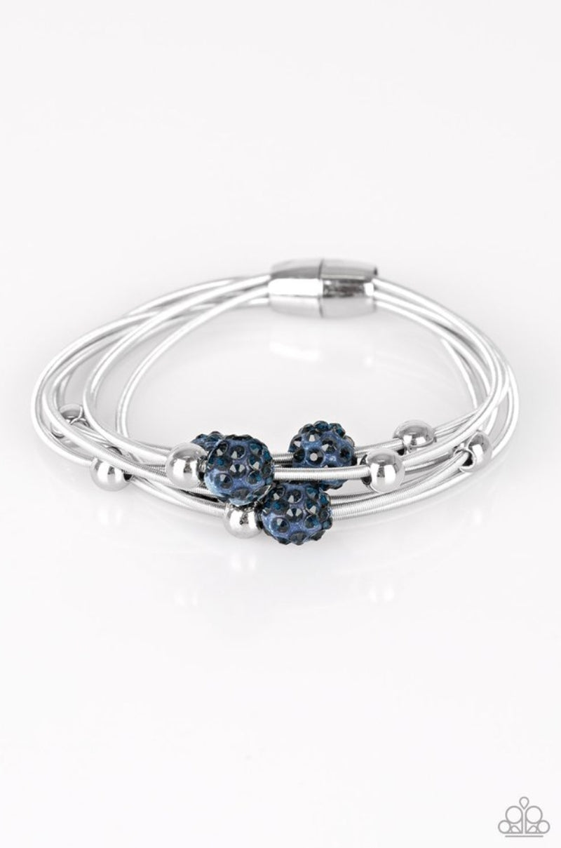 Radiating in blue rhinestones, glittery blue beads and classic silver beads are threaded along stretchy spring-like wires for a refined look. Features a magnetic closure.