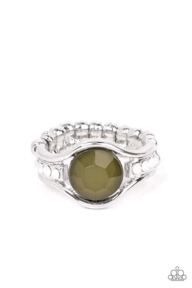 A dewy Olive Branch rhinestone seemingly floats inside the airy center of a band of opal white rhinestones, resulting in an enchanting pop of color atop the finger. Features a dainty stretchy band for a flexible fit.