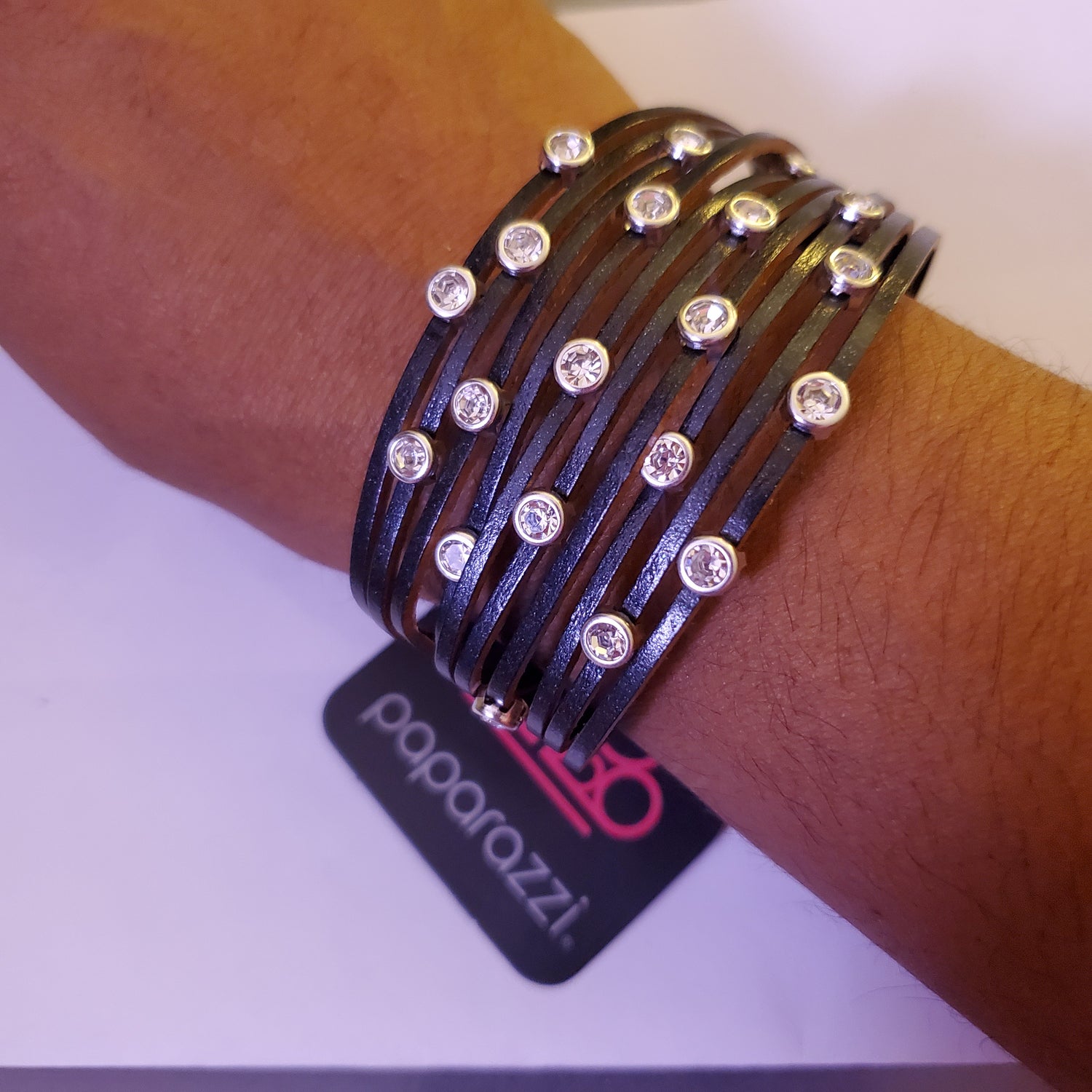 A thick black leather band has been spliced into numerous black wavy strands. Featuring sleek silver frames, glittery white rhinestones are sprinkled across the leather bands for a sassy finish. Features an adjustable snap closure.