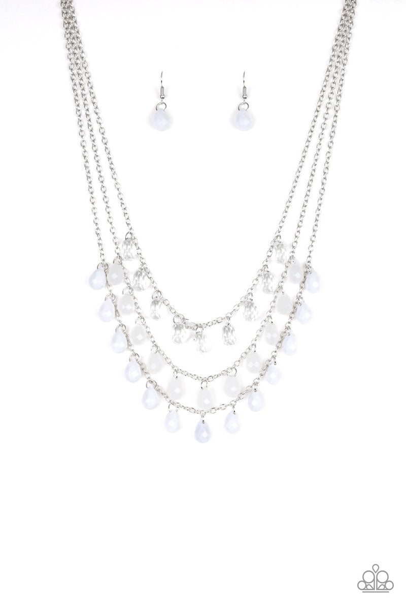 Featuring sparkling faceted finishes, layers of glassy, opaque, and white teardrop beads cascade below the collar for a whimsical ombre effect. Features an adjustable clasp closure.