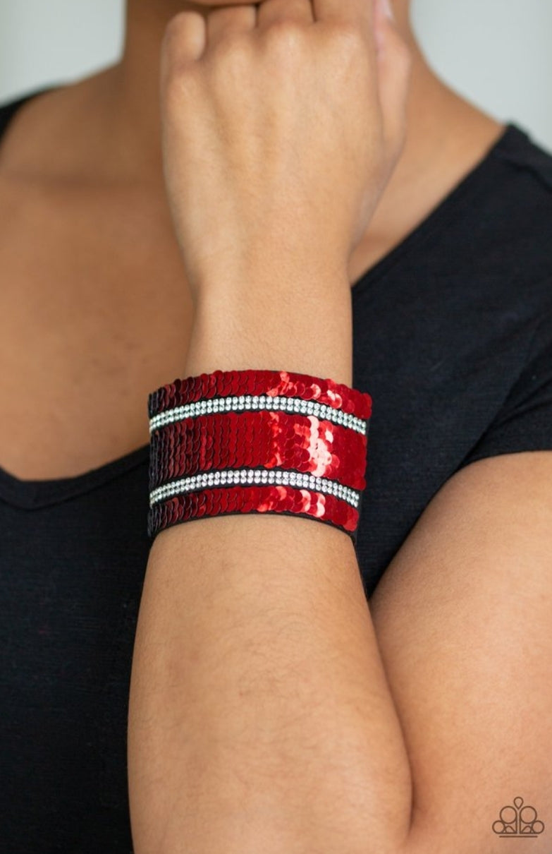 Infused with strands of blinding white rhinestones, row after row of shimmery sequins are stitched across the front of a spliced black suede band. Bracelet features reversible sequins that change from red to silver. Features an adjustable snap closure.