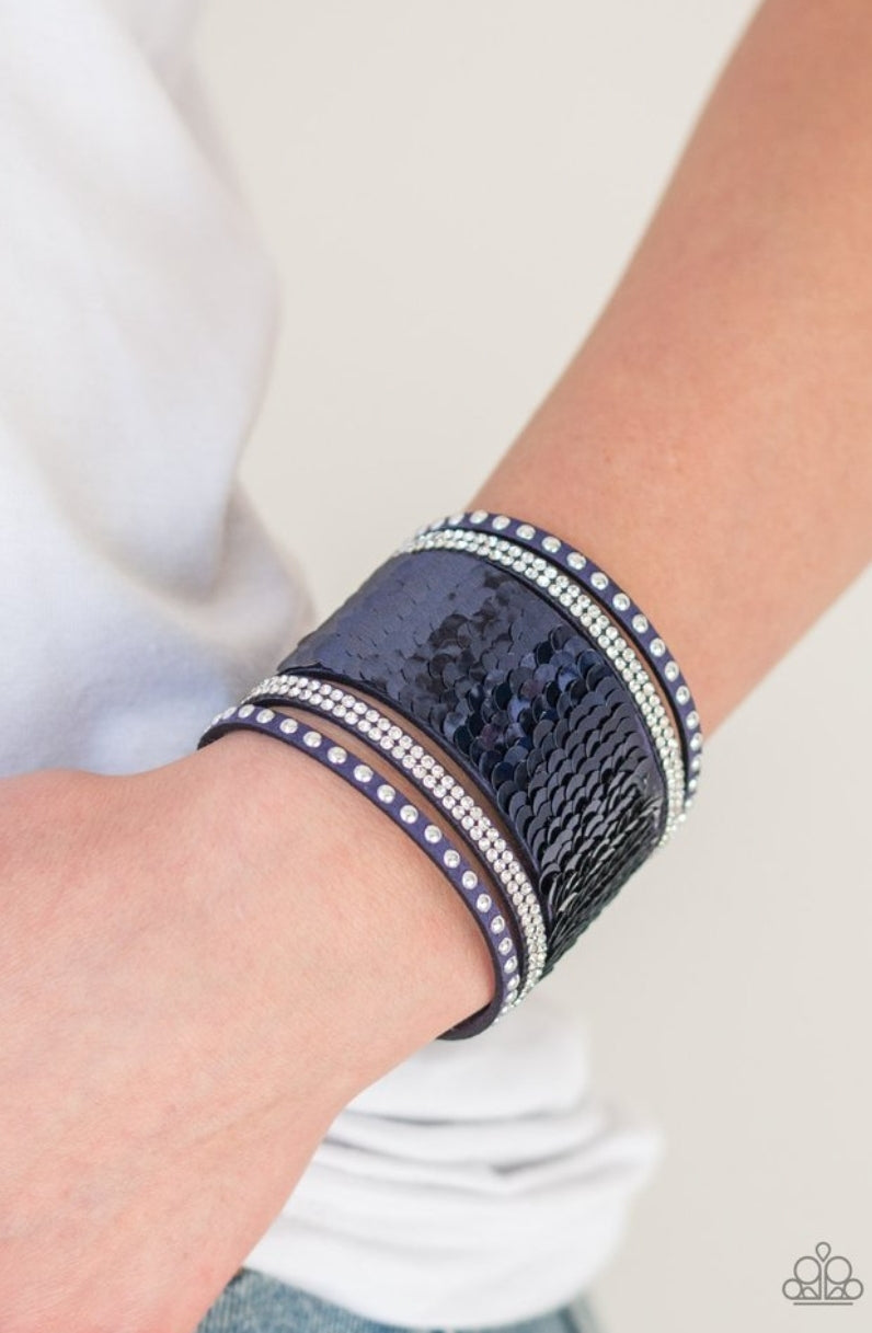 Shiny silver studs, glassy white rhinestones, and shimmering sequins are sprinkled across a thick blue suede band that has been spliced into five glittery rows. Bracelet features reversible sequins that change from blue to silver. Features an adjustable snap closure.