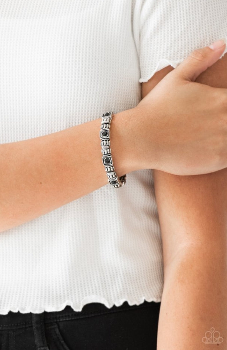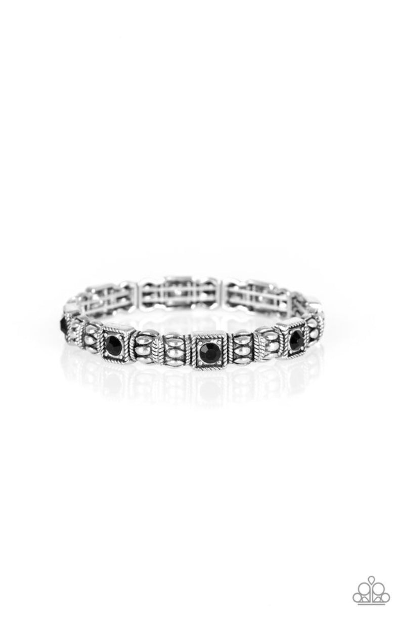 Infused with black rhinestone centers, ornate silver frames are threaded along stretchy bands, creating a refined look around the wrist.