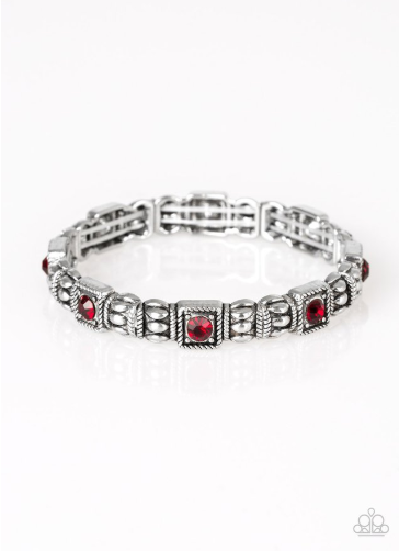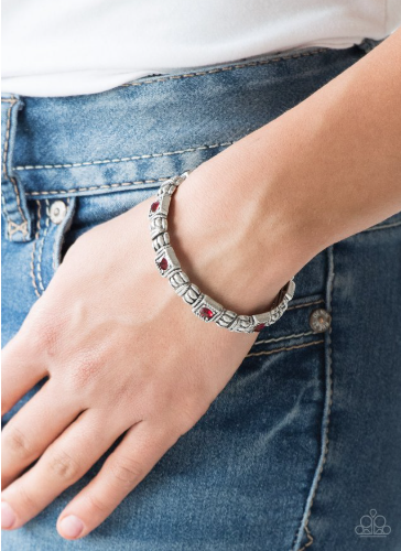 Infused with fiery red rhinestone centers, ornate silver frames are threaded along stretchy bands, creating a refined look around the wrist.