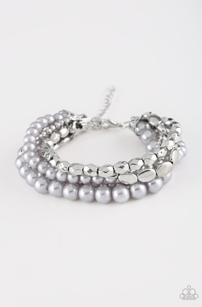 Varying in size and shape, pearly silver, and shimmery silver beads are threaded along invisible thread, creating classy layers across the wrist. Features an adjustable clasp closure.