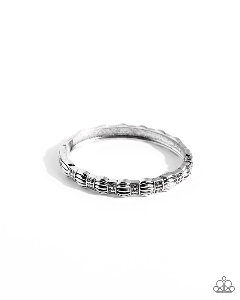 Rectangular silver frames dotted with dainty hematite rhinestones alternate with rippling silver accents around the wrist, coalescing in a versatile bangle-like bracelet. Features a hinged closure.