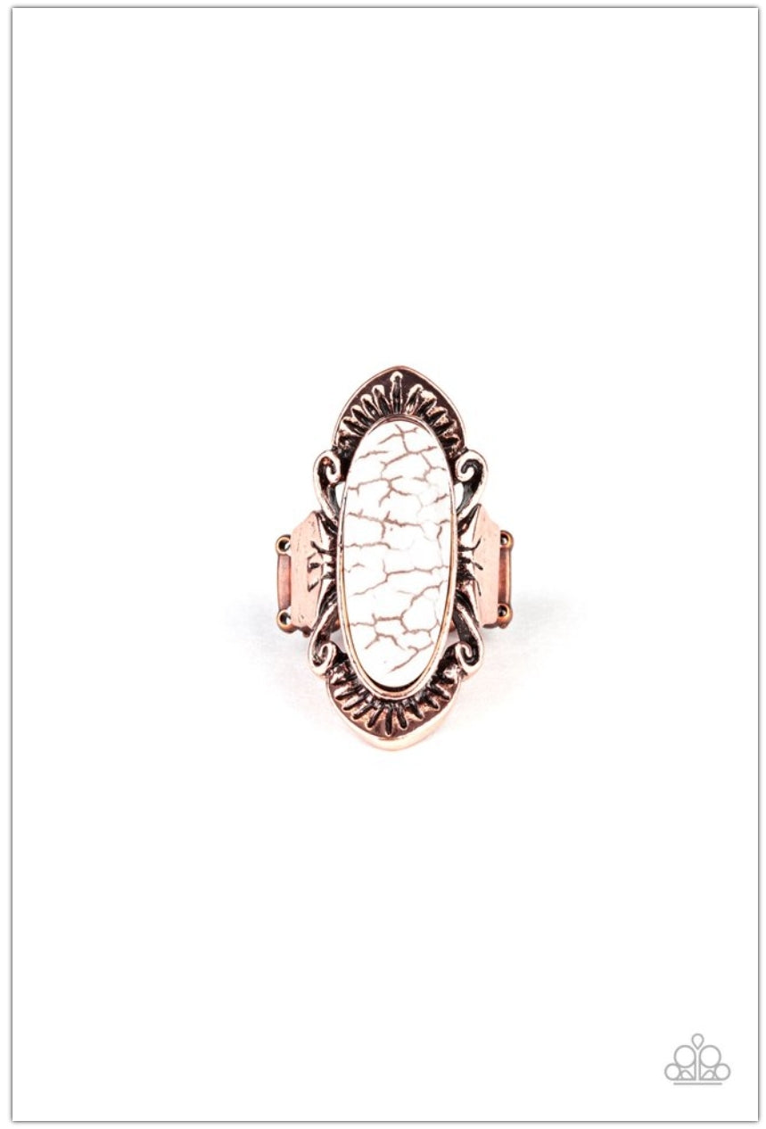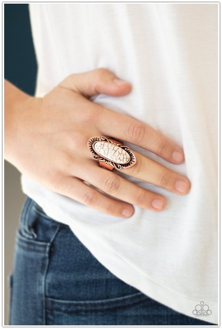 An oval white stone is nestled atop an antiqued copper frame etched with ornate detail, creating a decorative artisan inspired piece atop the finger. Features a stretchy band for a flexible fit.