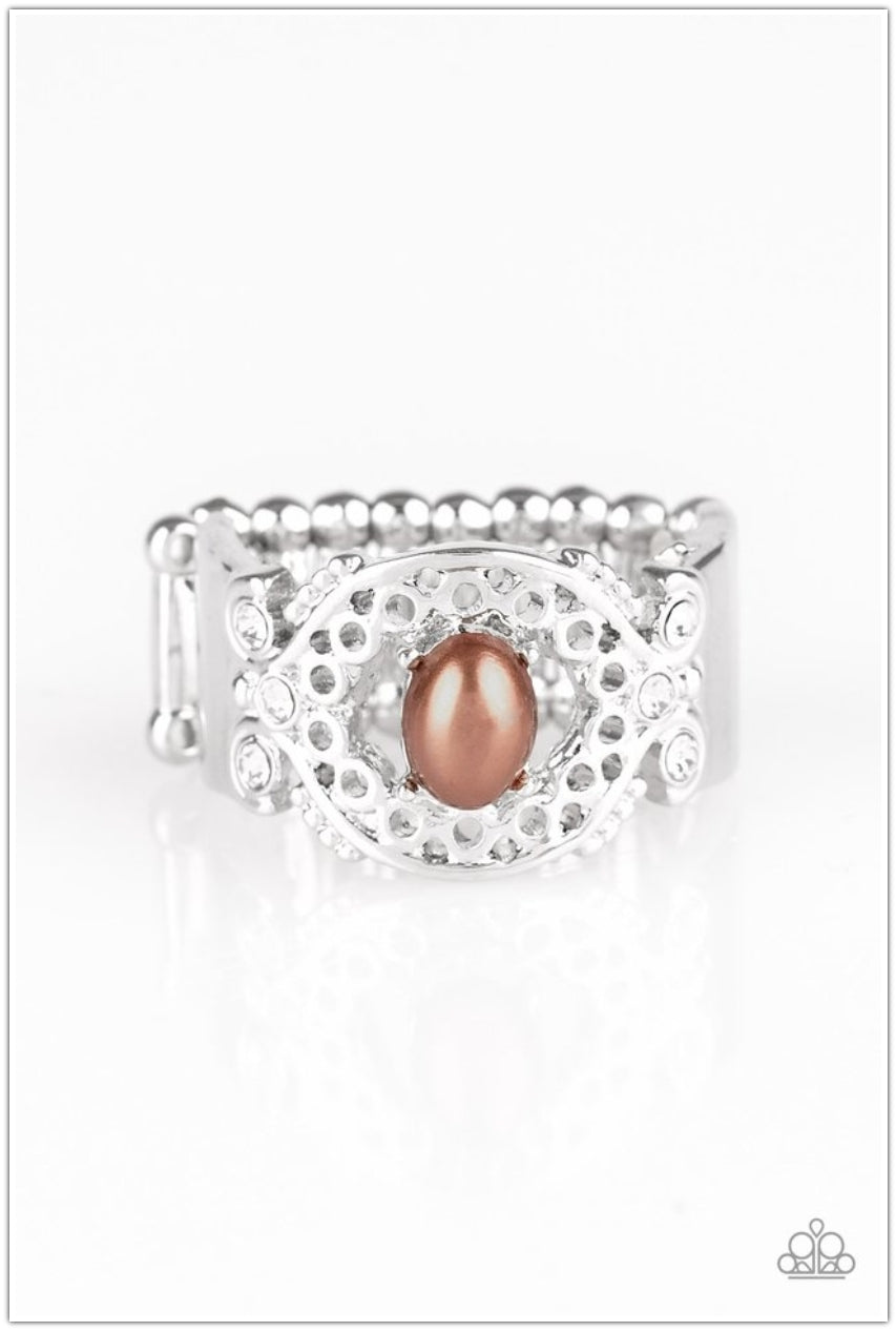 Dotted with glittery white rhinestones, an airy filigreed silver band arcs across the finger in a regal fashion. A pearly brown bead is pressed into the center of the band for a timeless finish. Features a stretchy band for a flexible fit.