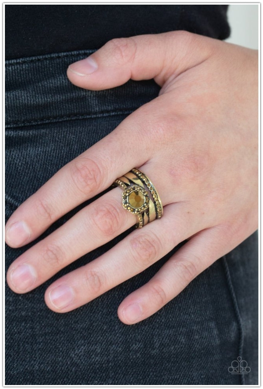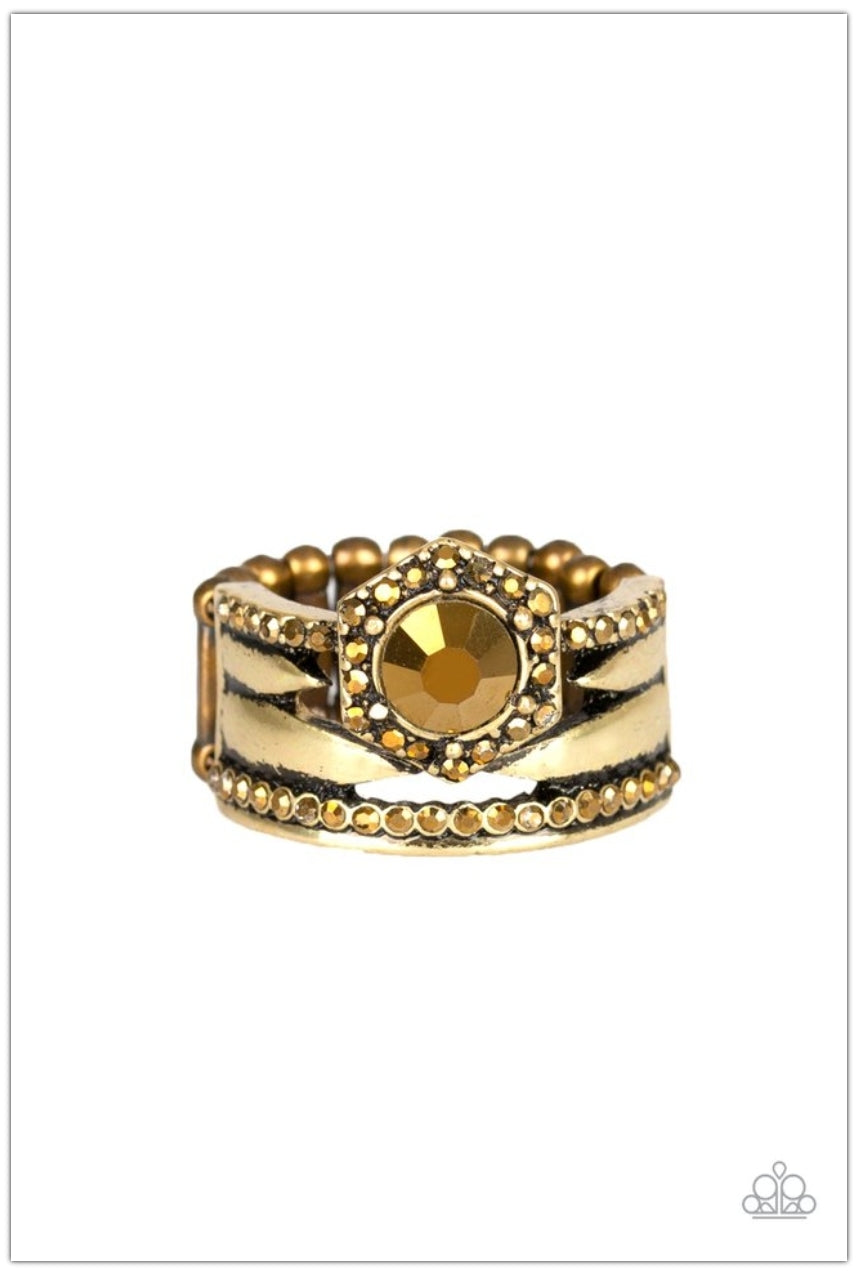 A collision of glistening brass bands and aurum rhinestone encrusted bands stack across the finger. Featuring a glittery aurum rhinestone center, a brass hexagon frame crowns the top of the layered bands for an edgy finish. Features a stretchy band for a flexible fit.