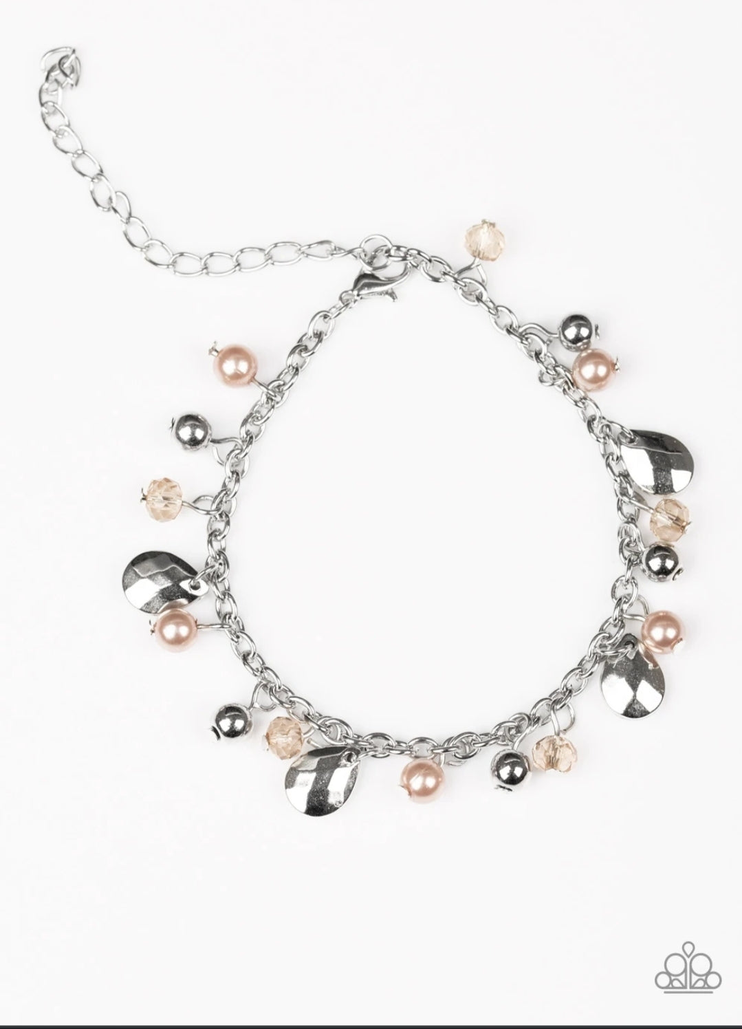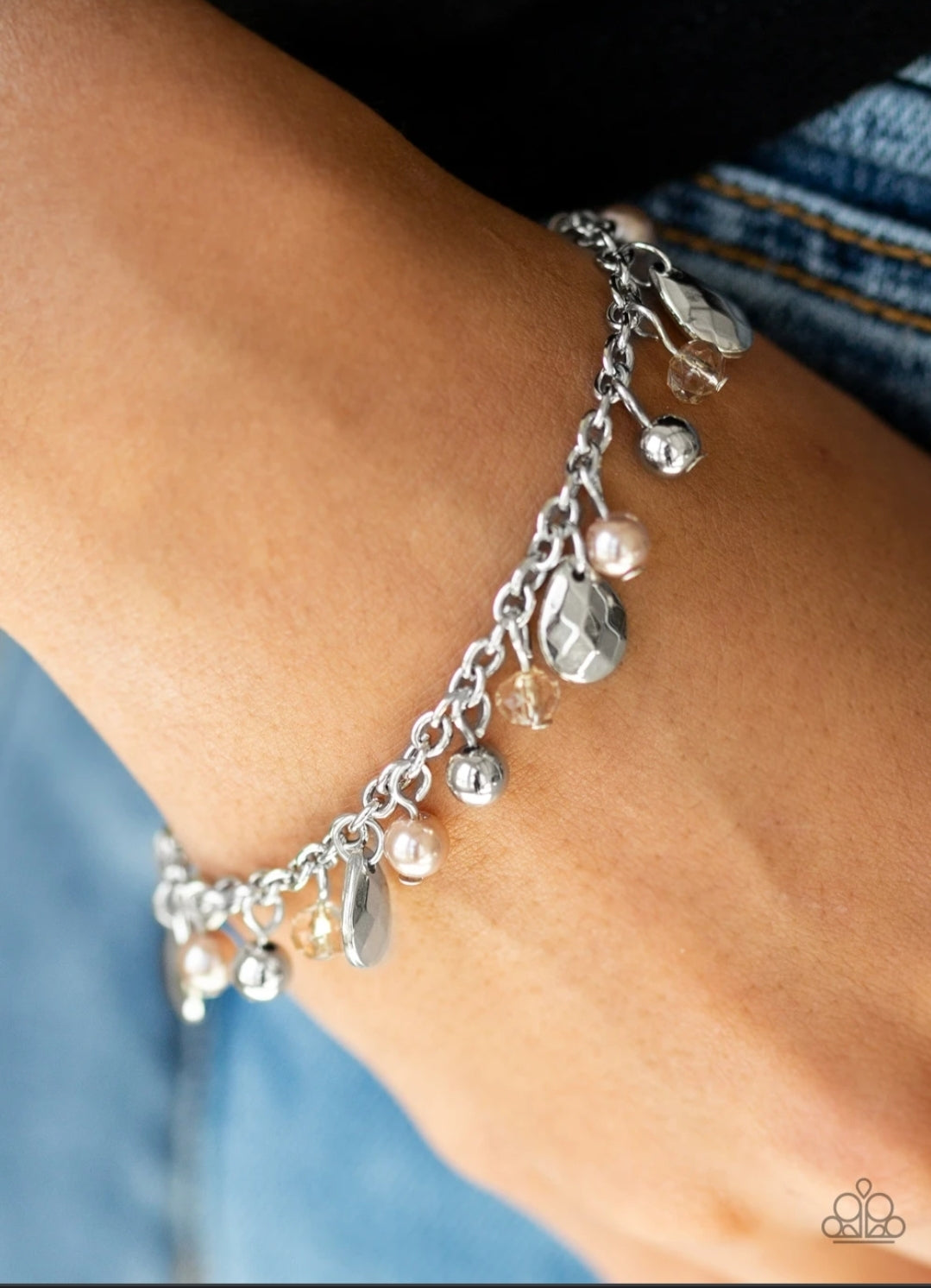 Pearly brown and crystal-like beads trickle from a silver chain, creating a bubbly fringe around the wrist. Faceted silver teardrops drip between the colorful beading, adding timeless shimmer to the seasonal look. Features an adjustable clasp closure.