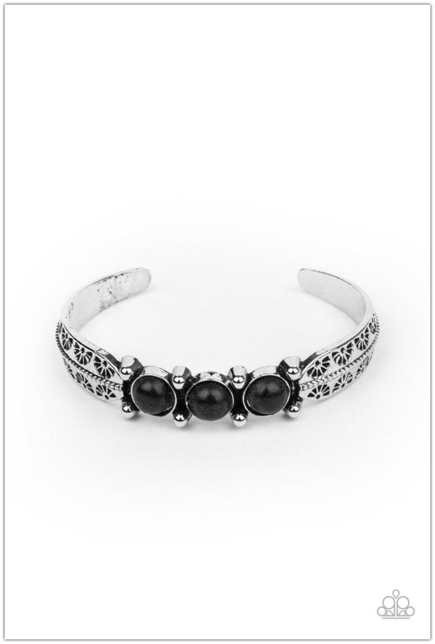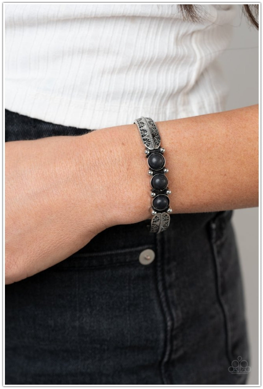 A trio of earthy black stones are encrusted along the center of a dainty silver studded cuff stamped in tribal inspired details for a seasonal flair.