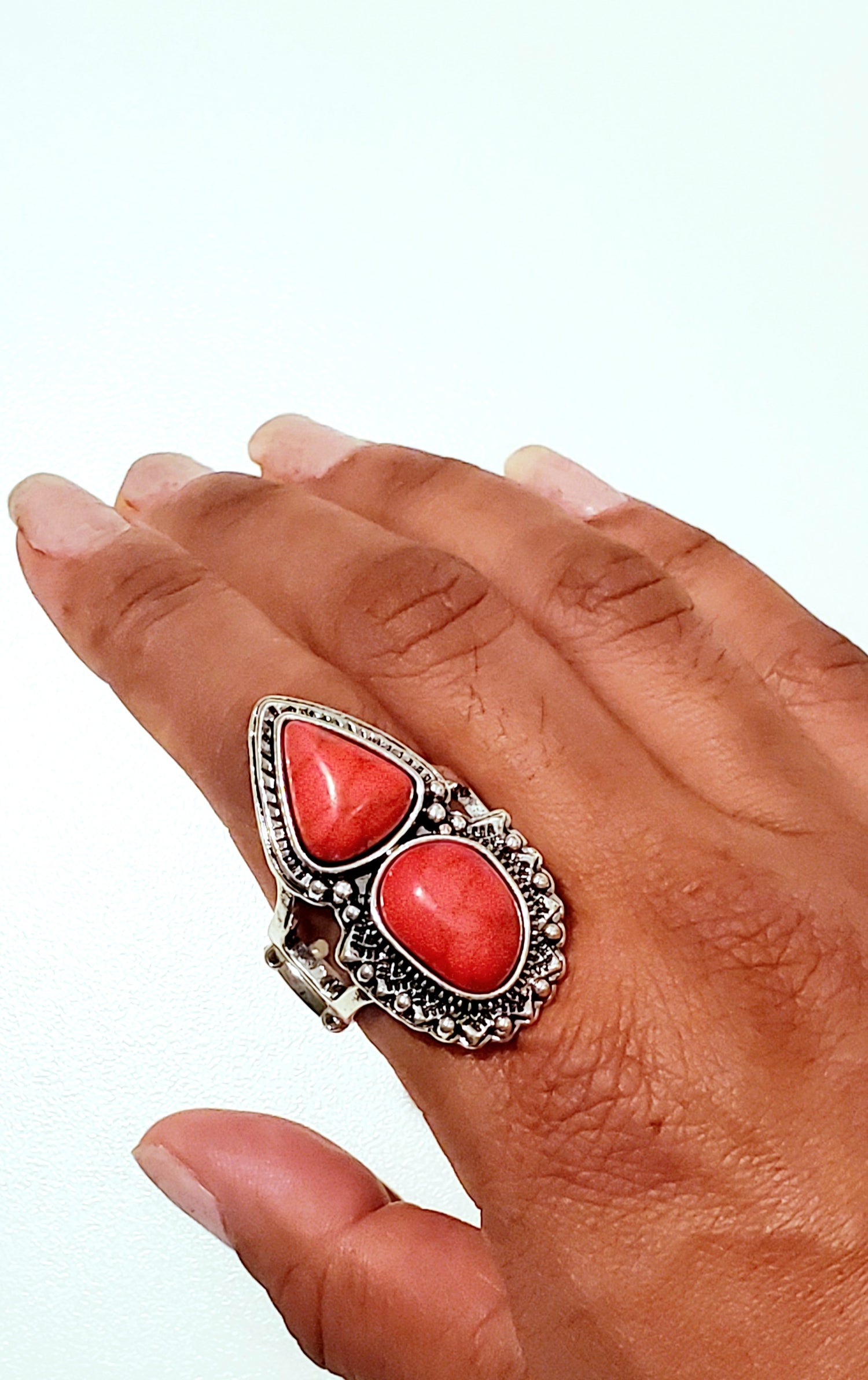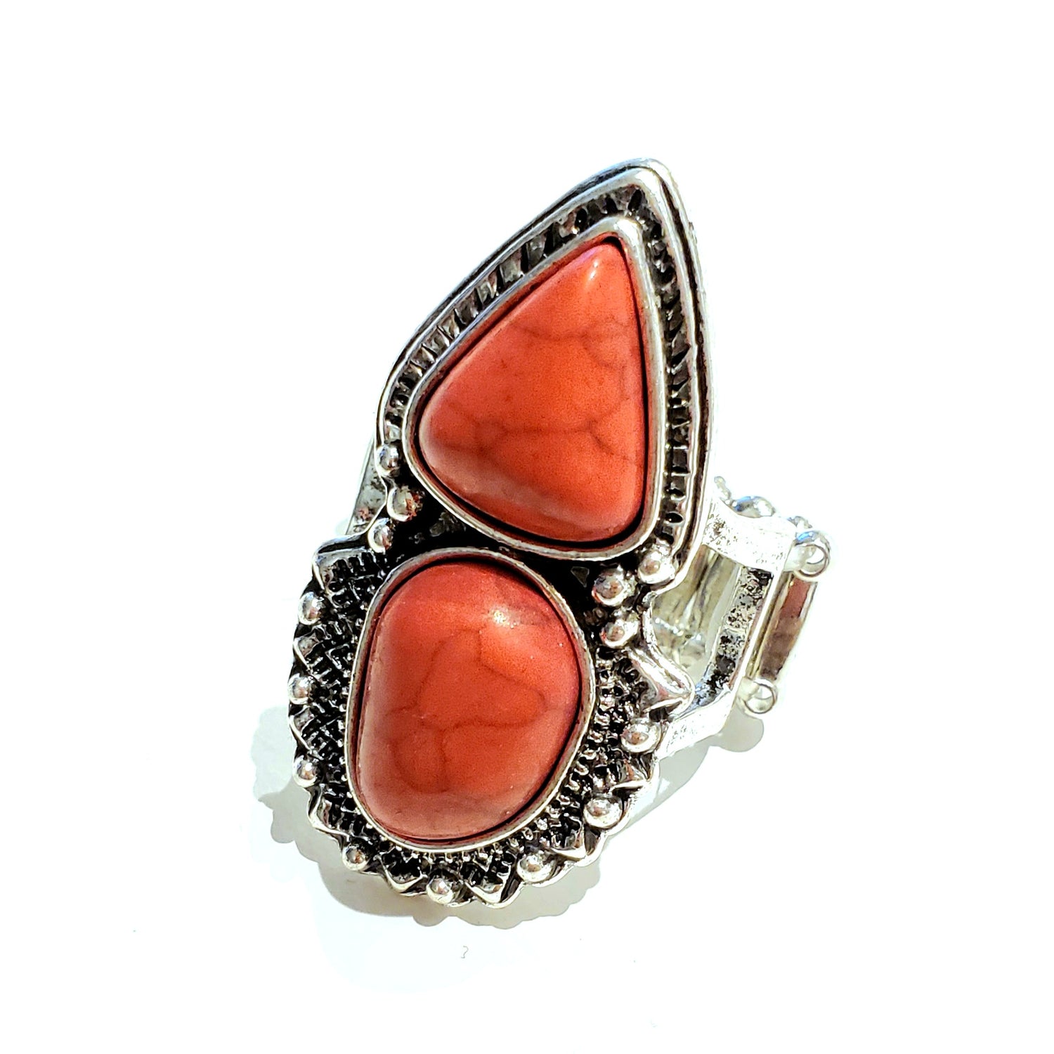 Chiseled into double layered shape, a fiery red stone is pressed into the center of a studded silver frame. Features a stretchy band for a flexible fit.