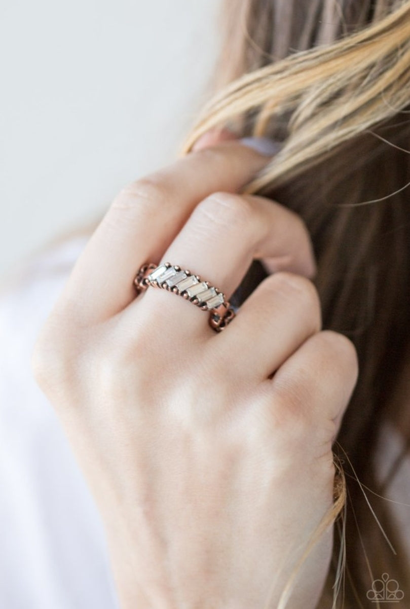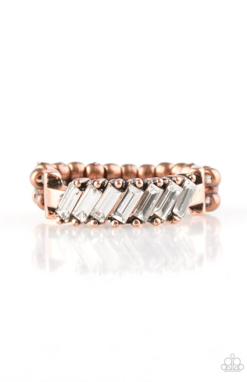 Featuring regal emerald-style cuts, dainty white rhinestones slant across the finger, coalescing into a glamourous band. Features a dainty stretchy band for a flexible fit.