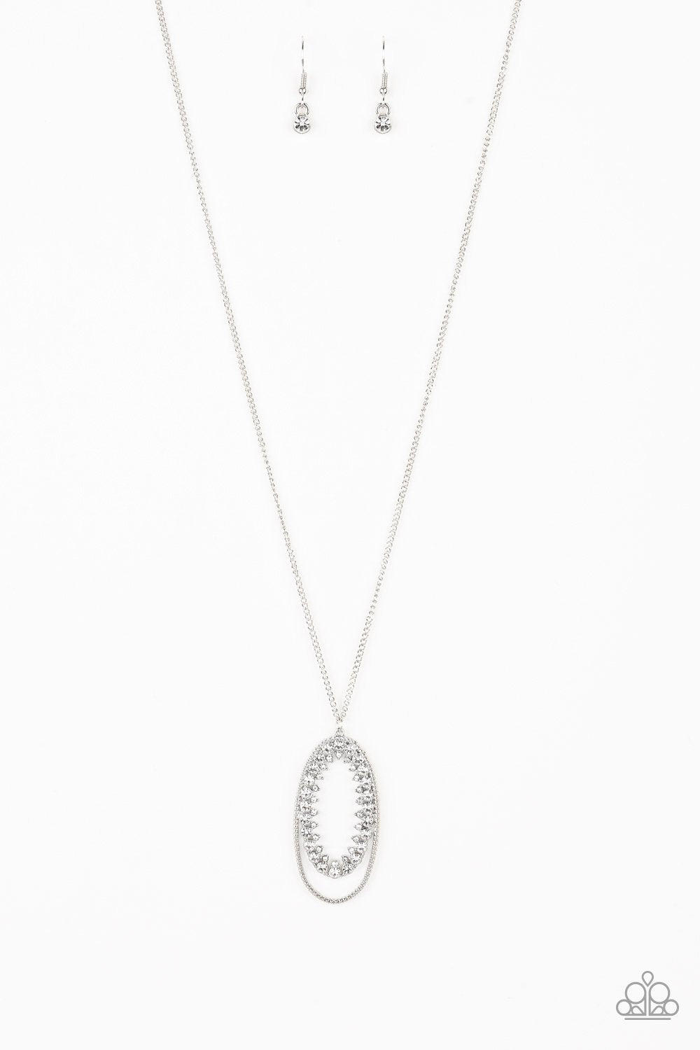 Ringed in a studded silver frame, glittery white rhinestones collect into glamorous pendant at the bottom of a lengthened silver chain for a refined flair. Features an adjustable clasp closure.