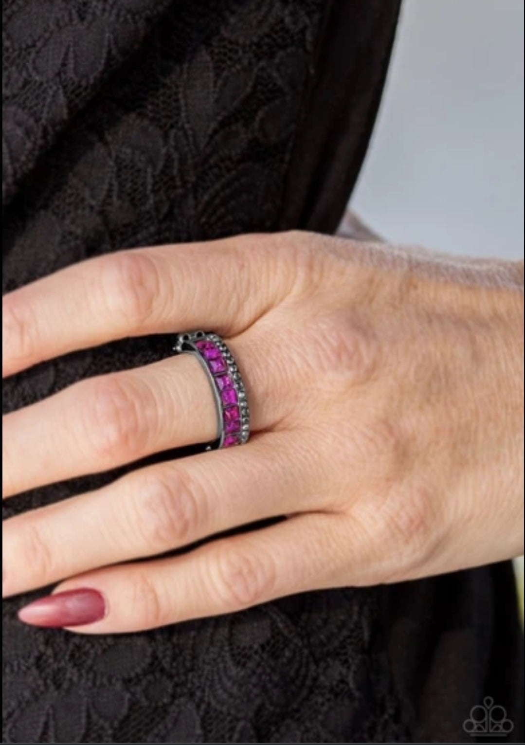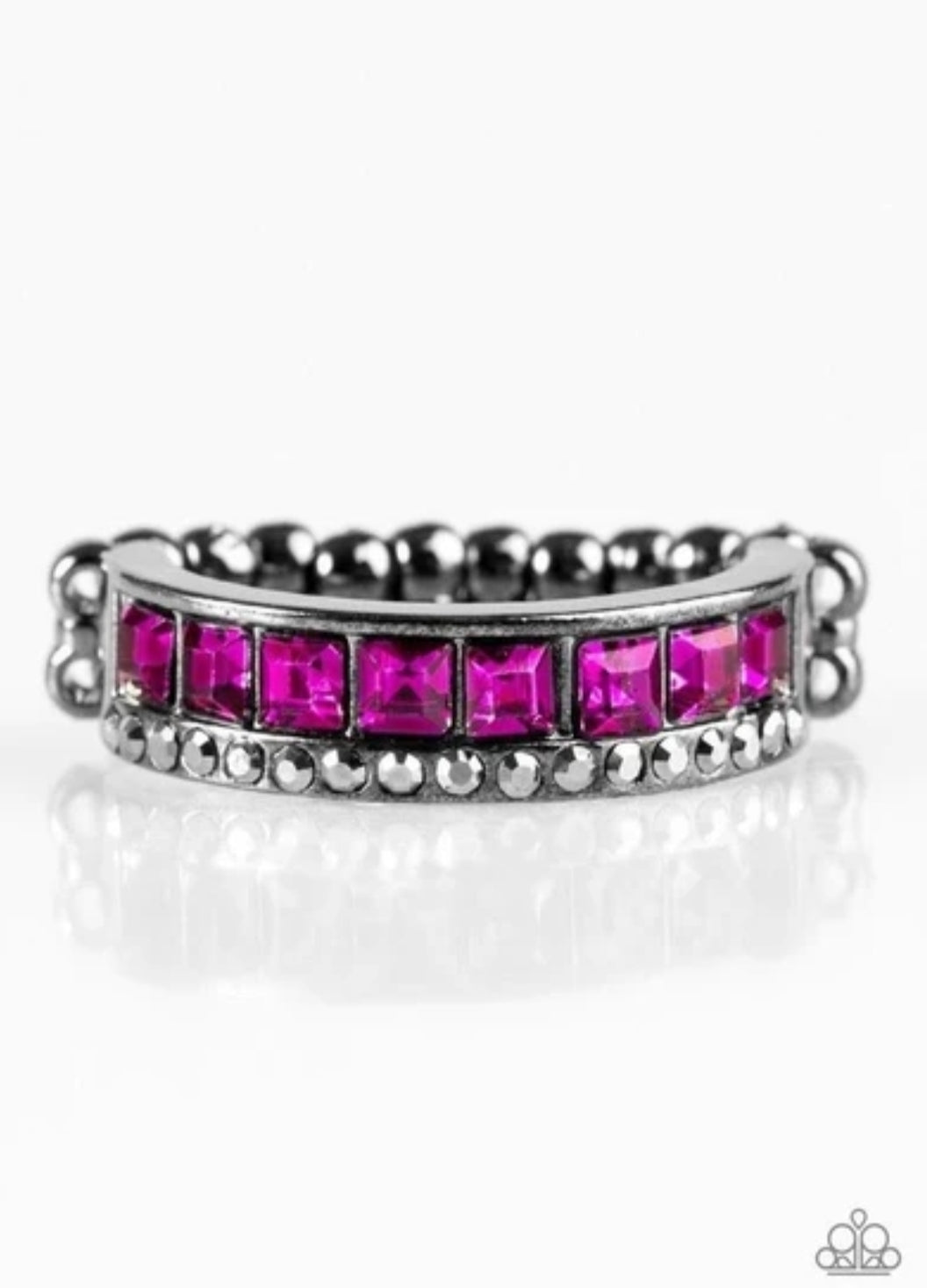 Featuring edgy square cuts, a row of glittery pink rhinestones are encrusted along a black band. Dainty hematite rhinestones are encrusted along the top of the band, adding classic shimmer to the sassy palette. Features a dainty stretchy band for a flexible fit.