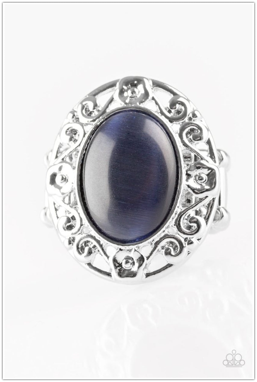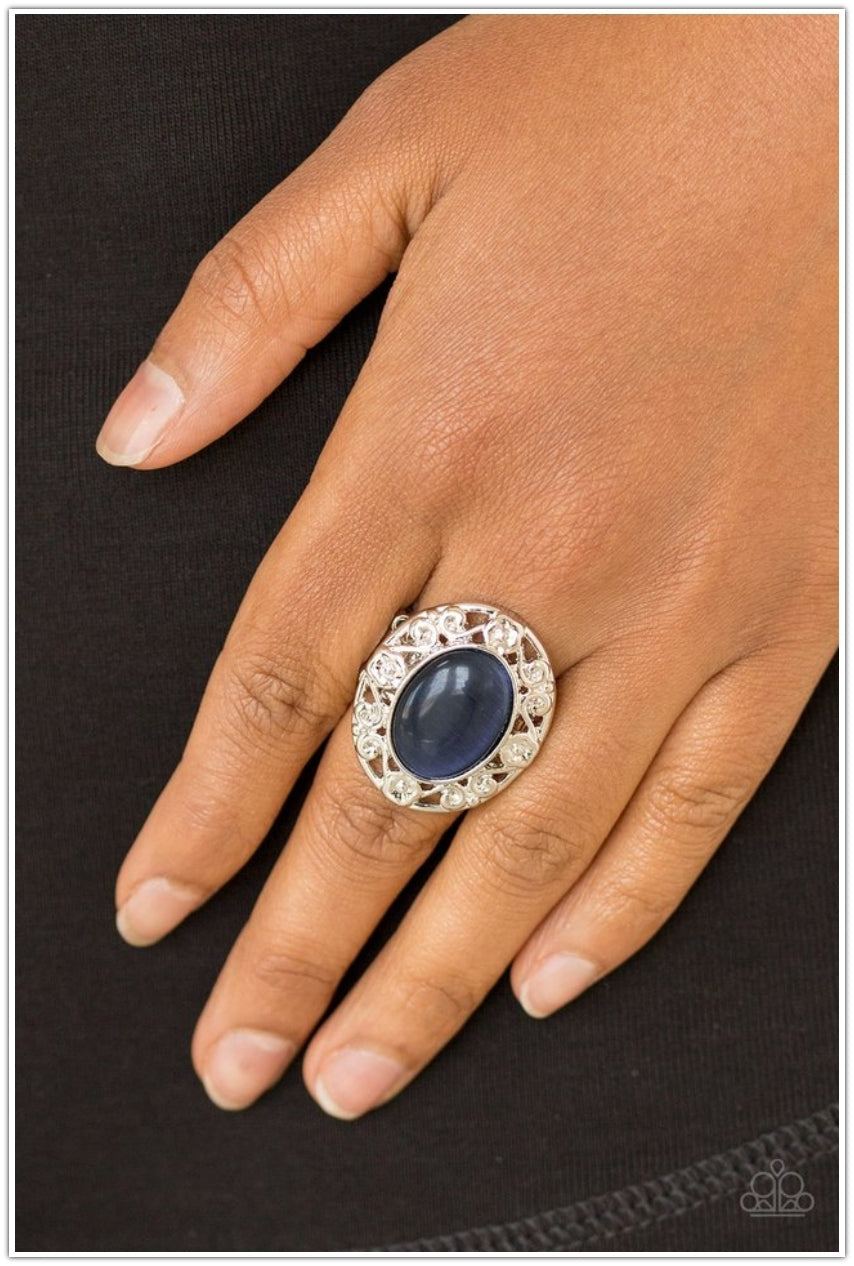 Shimmery floral-like filigree swirls around a glowing blue moonstone center, creating a whimsical centerpiece atop the finger. Features a stretchy band for a flexible fit.