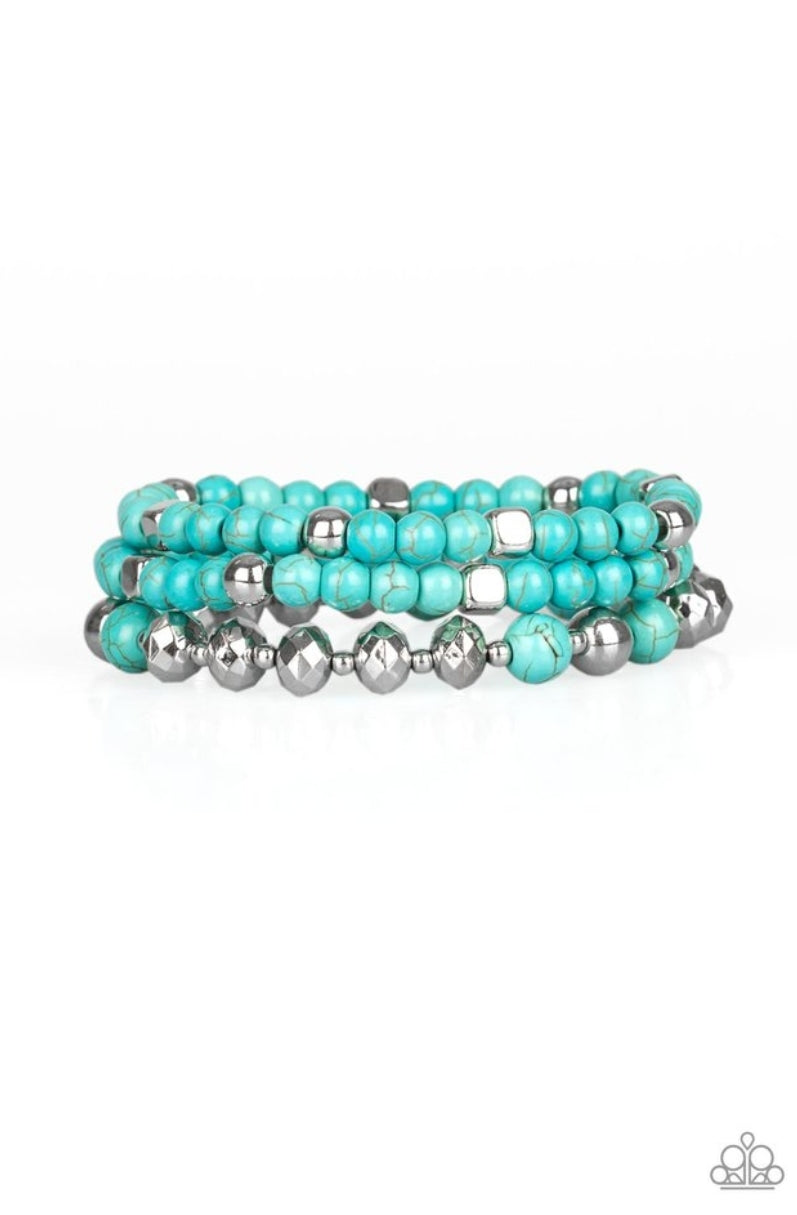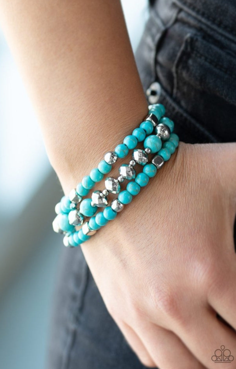 A collection of refreshing turquoise stones, faceted blue beads, and shimmery silver accents are threaded along stretchy bands, creating colorful layers around the wrist.
