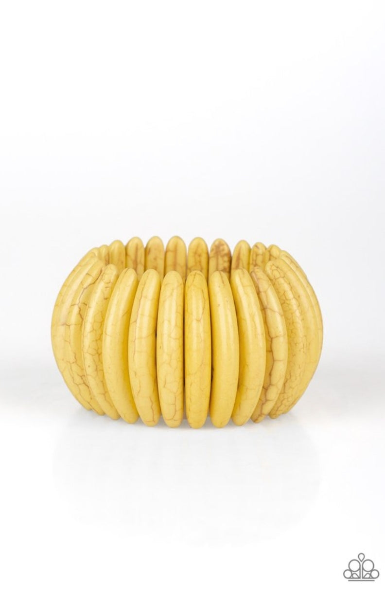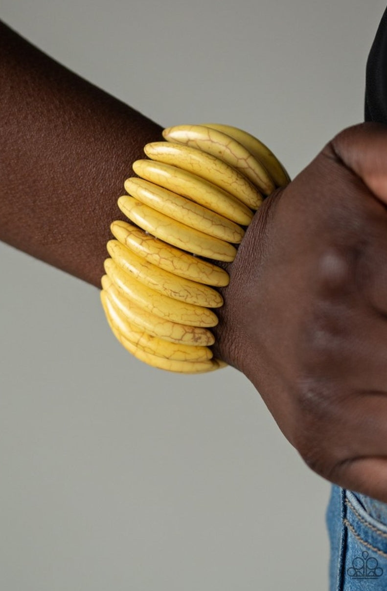Chiseled into earthy crescent shapes, sunny yellow stones are threaded along stretchy bands around the wrist for an artisan inspired look.