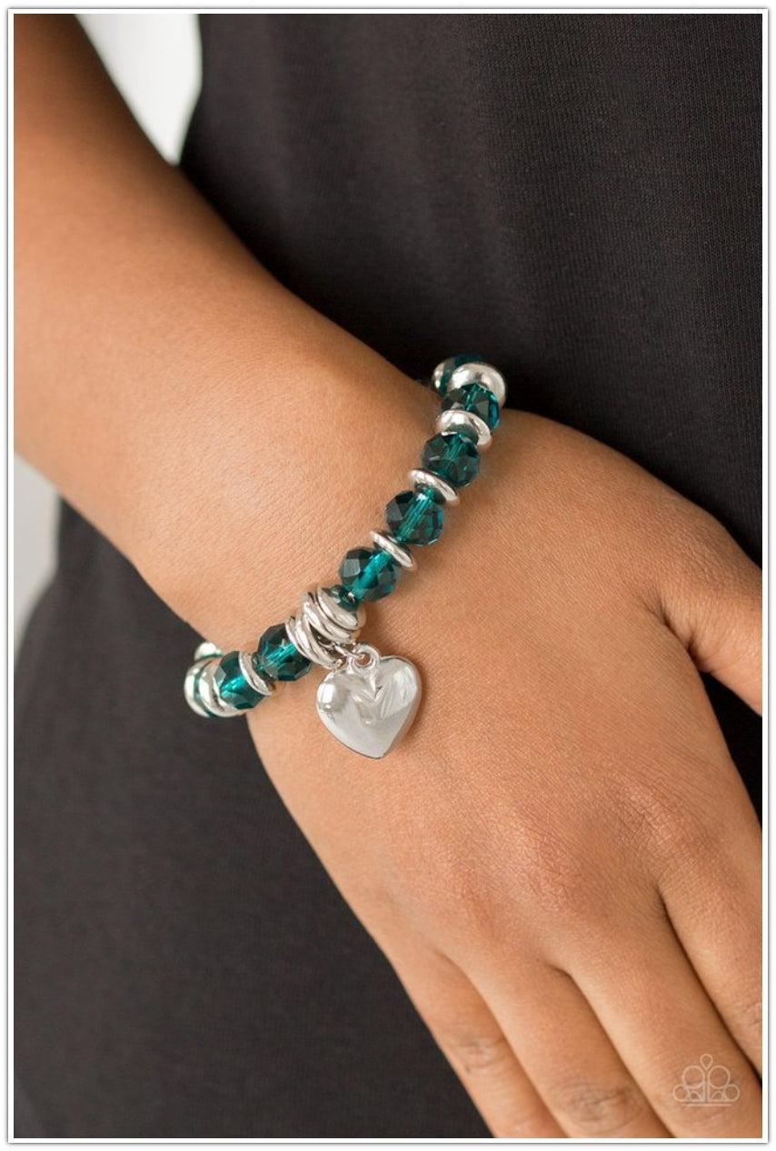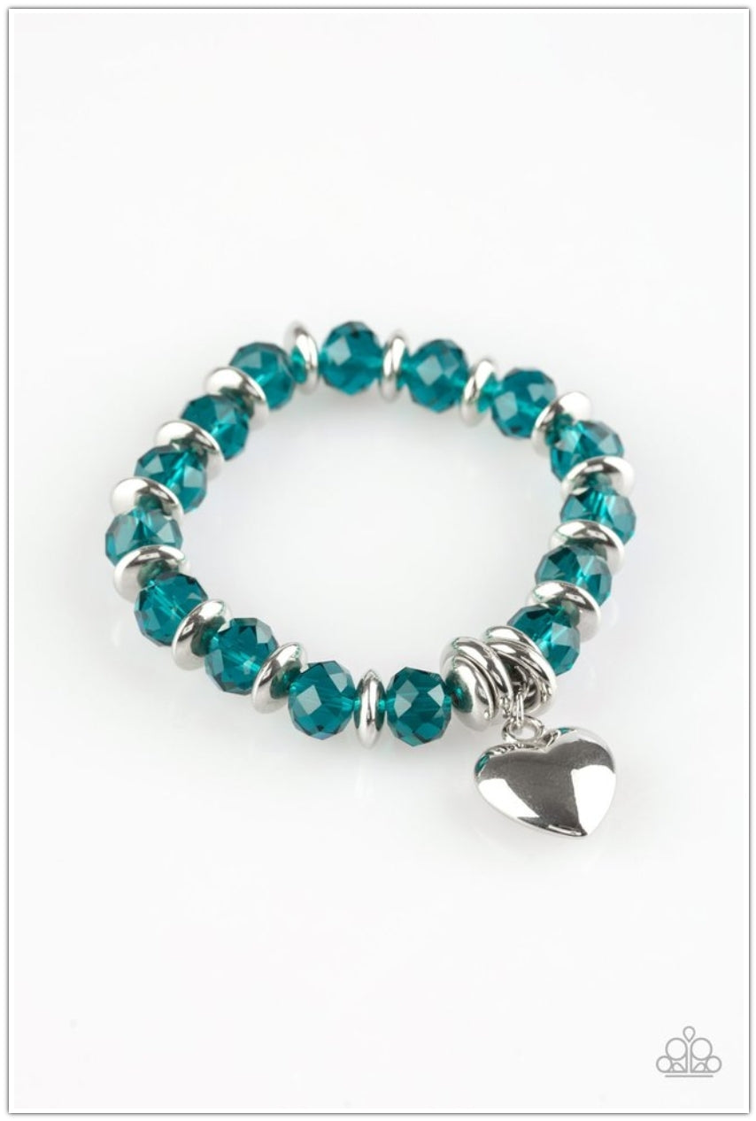 Sparkling blue crystal-like beads and shimmery silver accents are threaded along a stretchy band. An oversized silver heart charm swings from the wrist for a whimsical finish.
