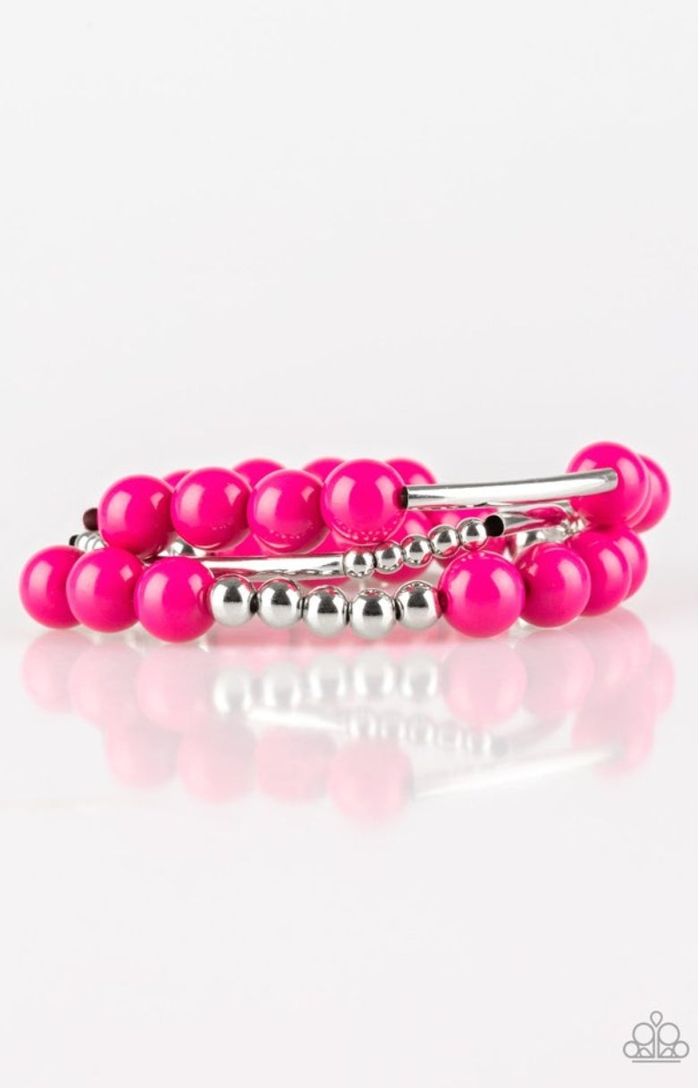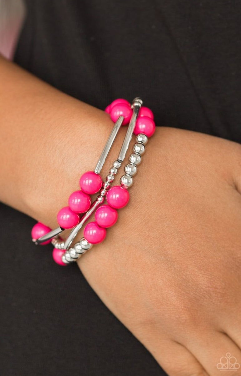 Polished pink beads and mismatched silver beads are threaded along stretchy bands, creating colorful layers across the wrist.