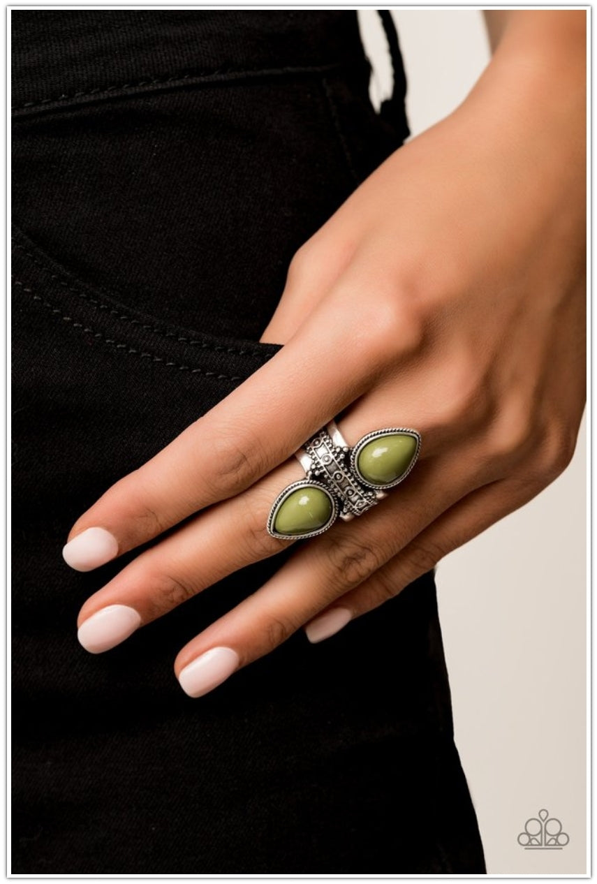 Tinted in the zesty green hue of Guacamole, polished teardrop beads flank an ornately studded silver band for a trendsetting look. Features a stretchy band for a flexible fit.