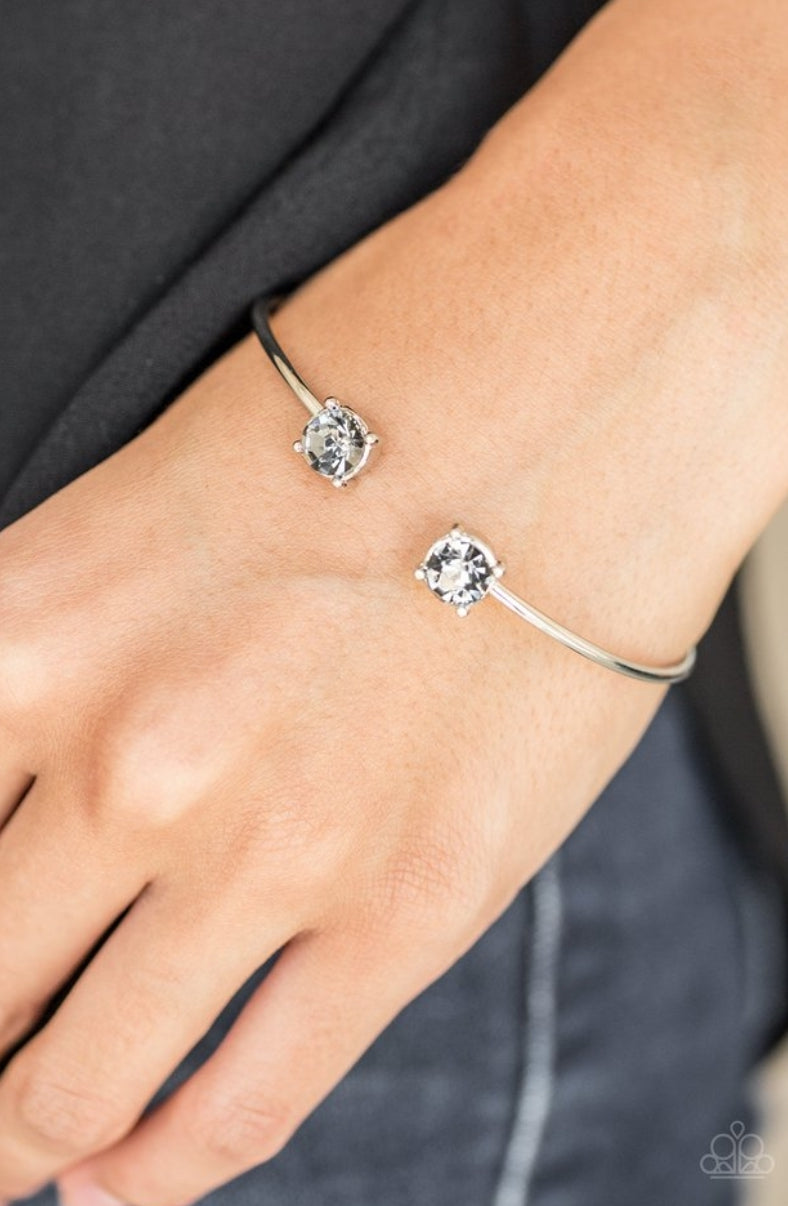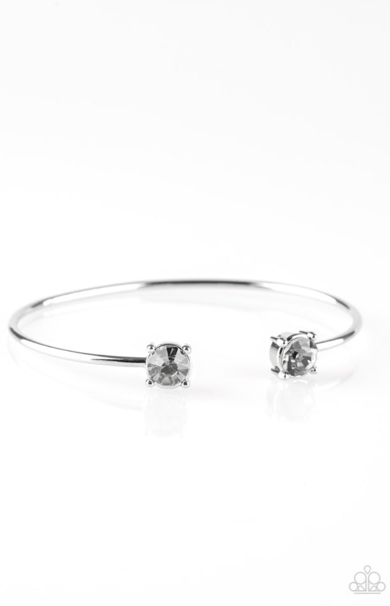 Attached to a curling silver bar, smoky rhinestones are pressed into silver fittings, creating a dainty cuff.