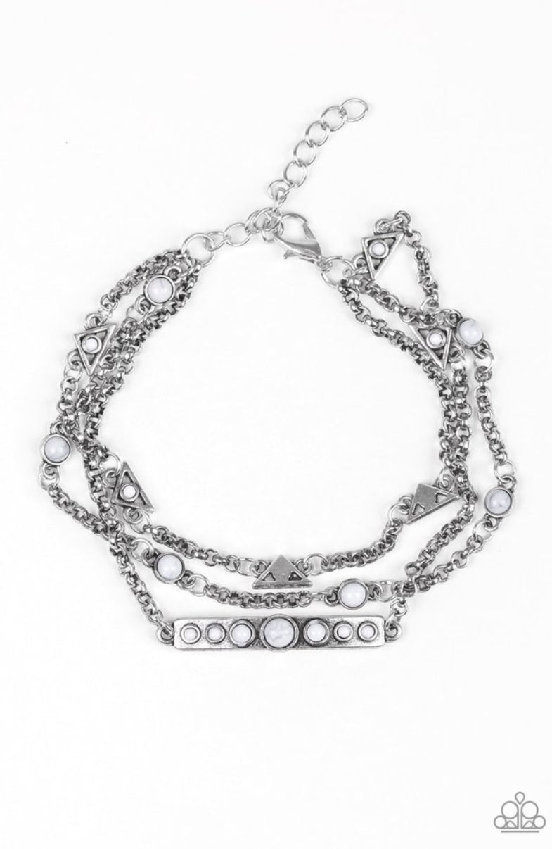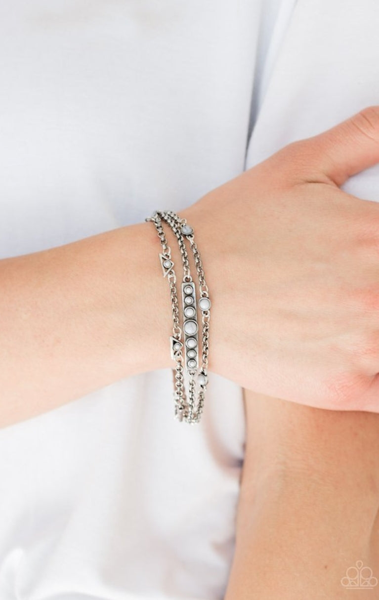 Featuring dainty gray stone accents, dainty silver triangles, round frames, and a stone studded plate trickle along three shimmery silver chains across the wrist for a seasonal look. Features an adjustable clasp closure.