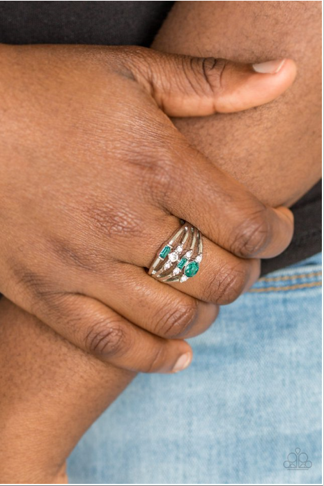 Featuring round, oval, and emerald style cuts, dainty green and white rhinestones are sprinkled along dainty silver bands, coalescing into a refined frame. Features a dainty stretchy band for a flexible fit.