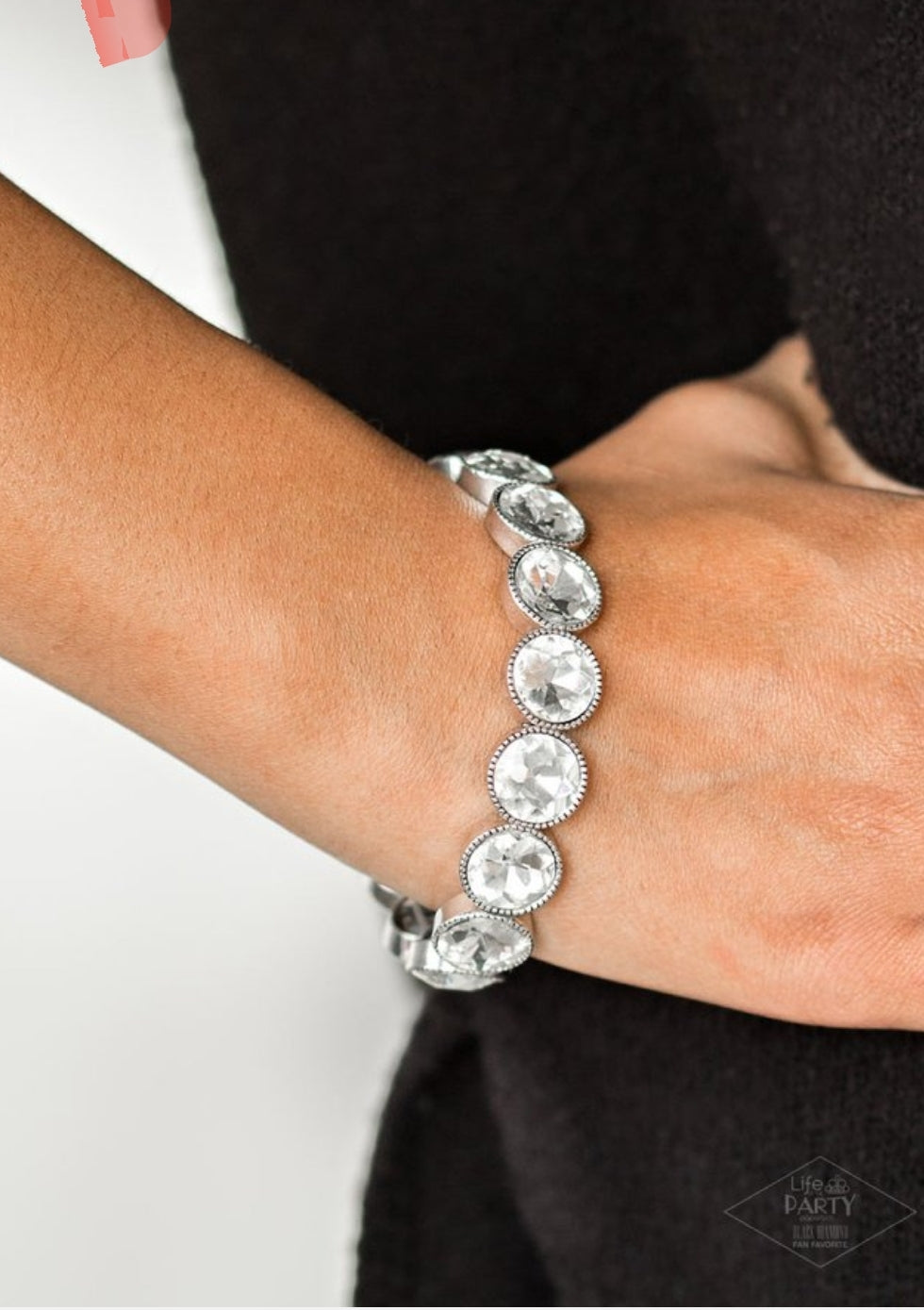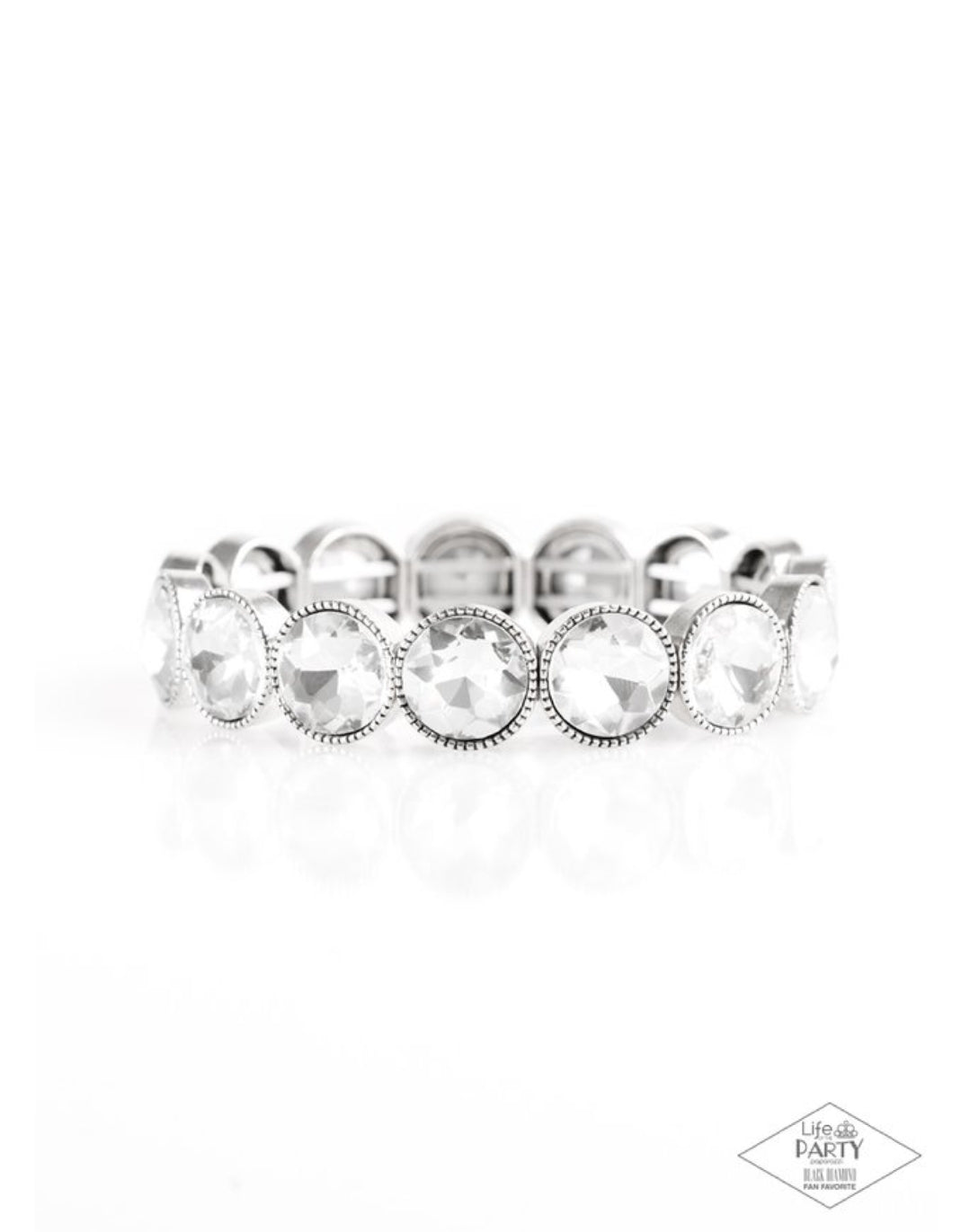 Faceted white gems are pressed into sleek silver frames. The glittery frames are threaded along elastic stretchy bands, creating a glamorous look around the wrist.