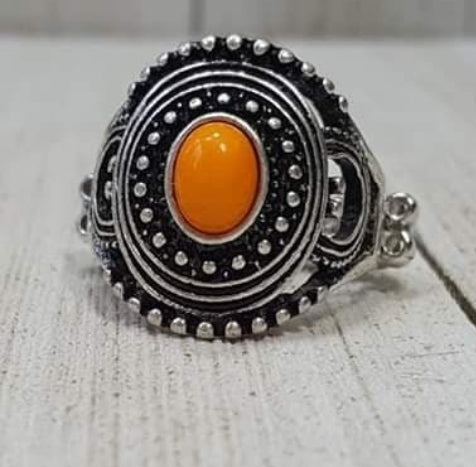 A shiny orange bead is pressed into the center of a round frame radiating with silver studded detail for a seasonal look. Features a dainty stretchy band for a flexible fit.