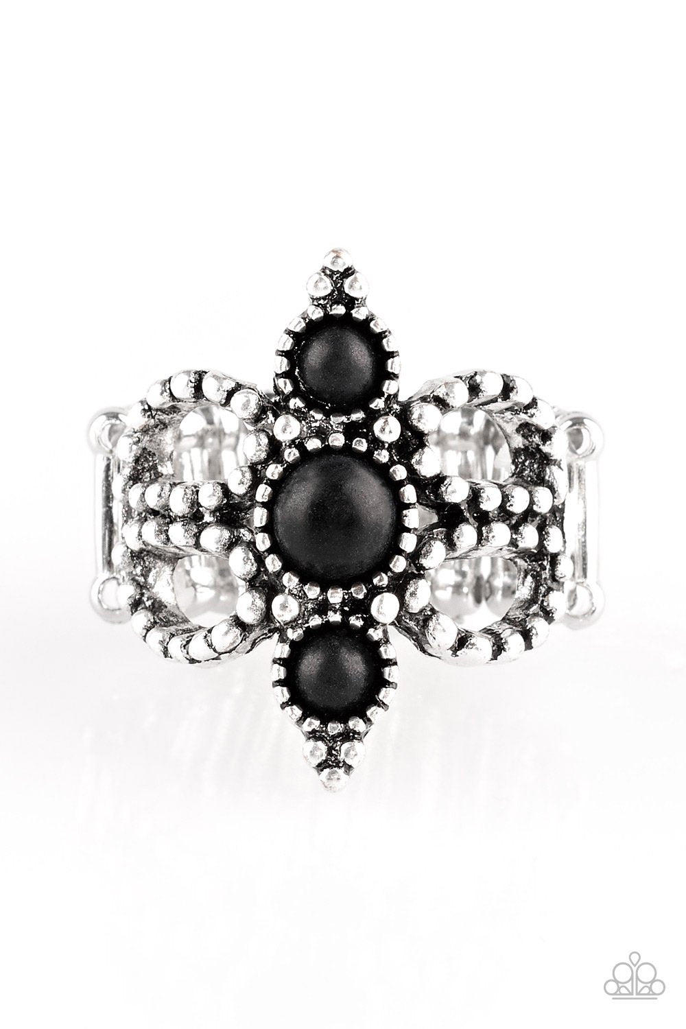 Dainty black stones stack down the center of a frilly silver band radiating with studded textures. Features a stretchy band for a flexible fit.
