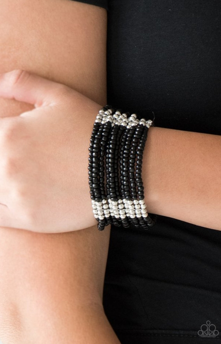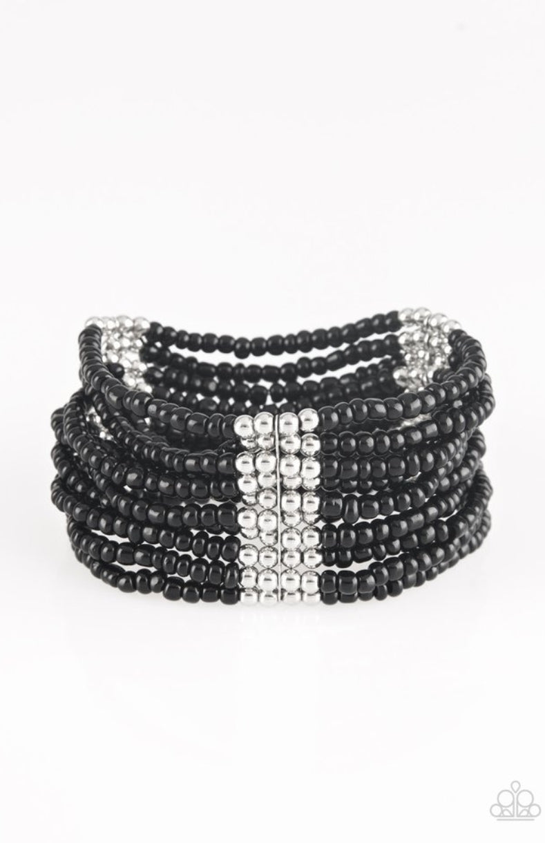 Joined together with metallic fittings, countless black seed beads are threaded along stretchy elastic bands. Sections of dainty silver beads are sprinkled along the colorful layers, adding hints of shimmer to the seasonal palette.