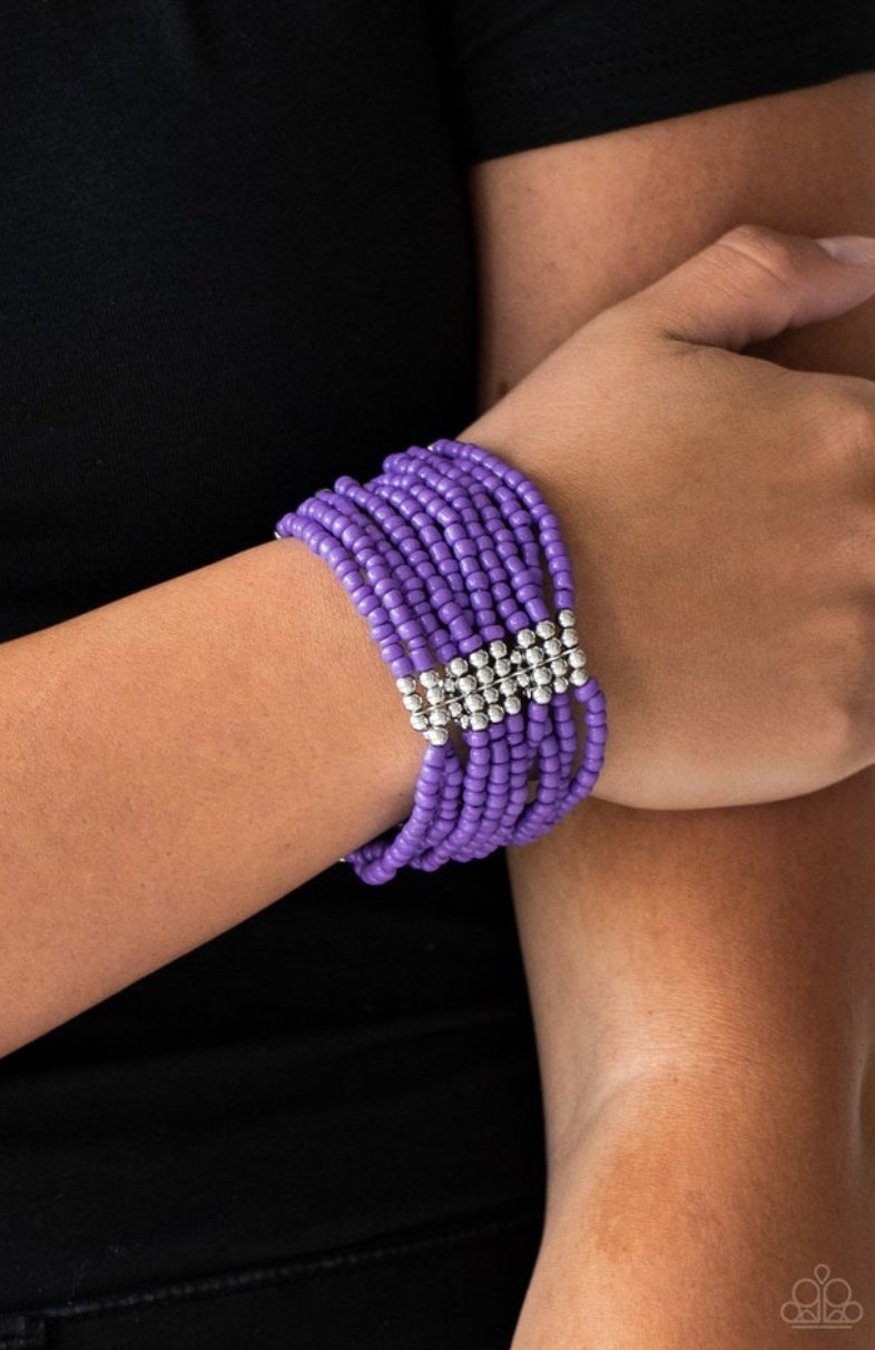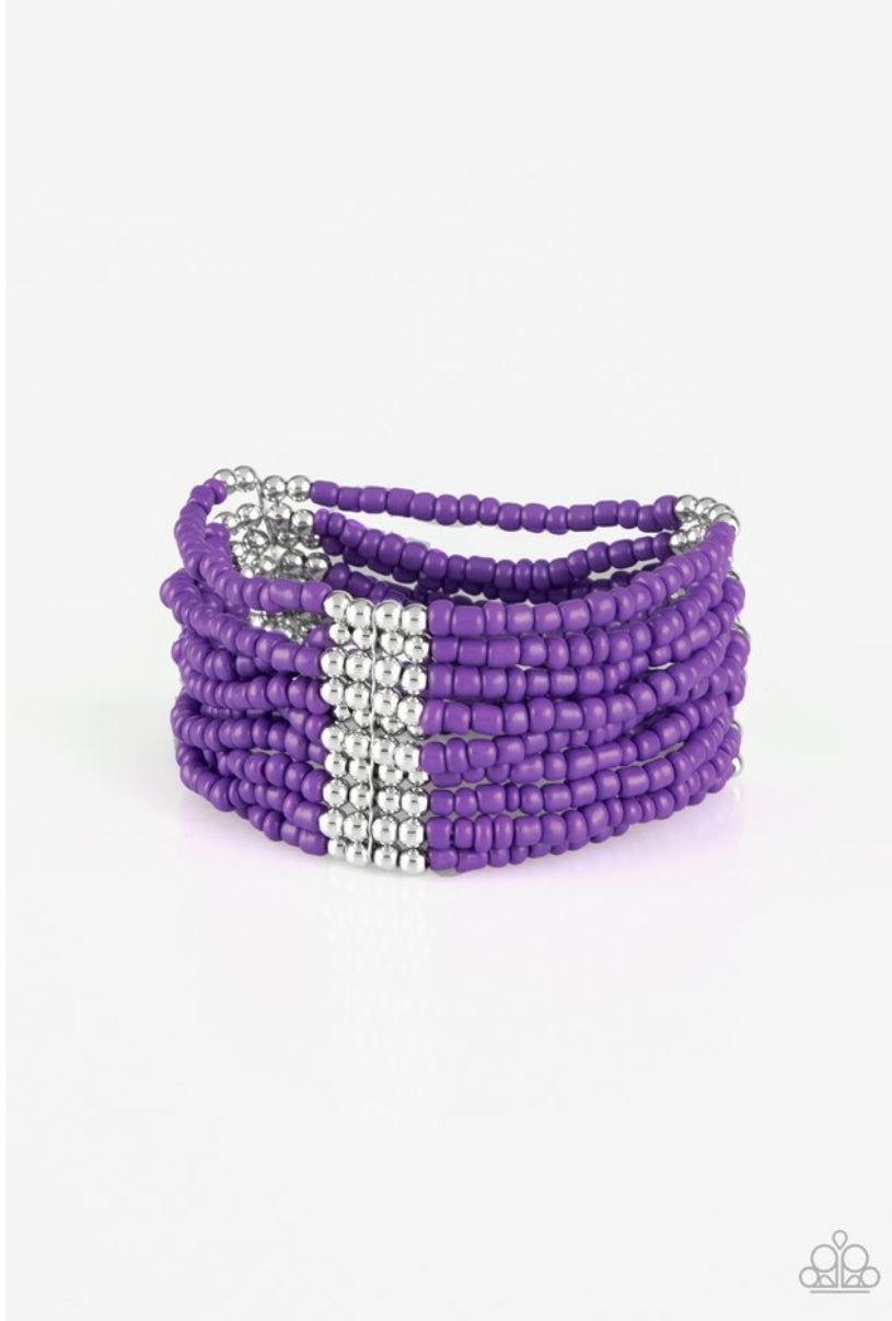 Joined together with metallic fittings, countless purple seed beads are threaded along stretchy elastic bands. Sections of dainty silver beads are sprinkled along the colorful layers, adding hints of shimmer to the seasonal palette.